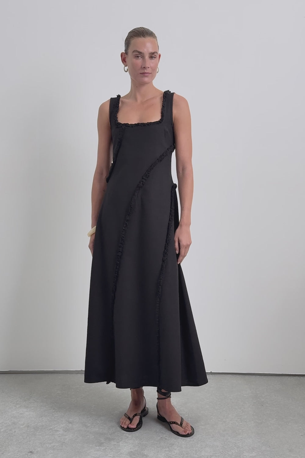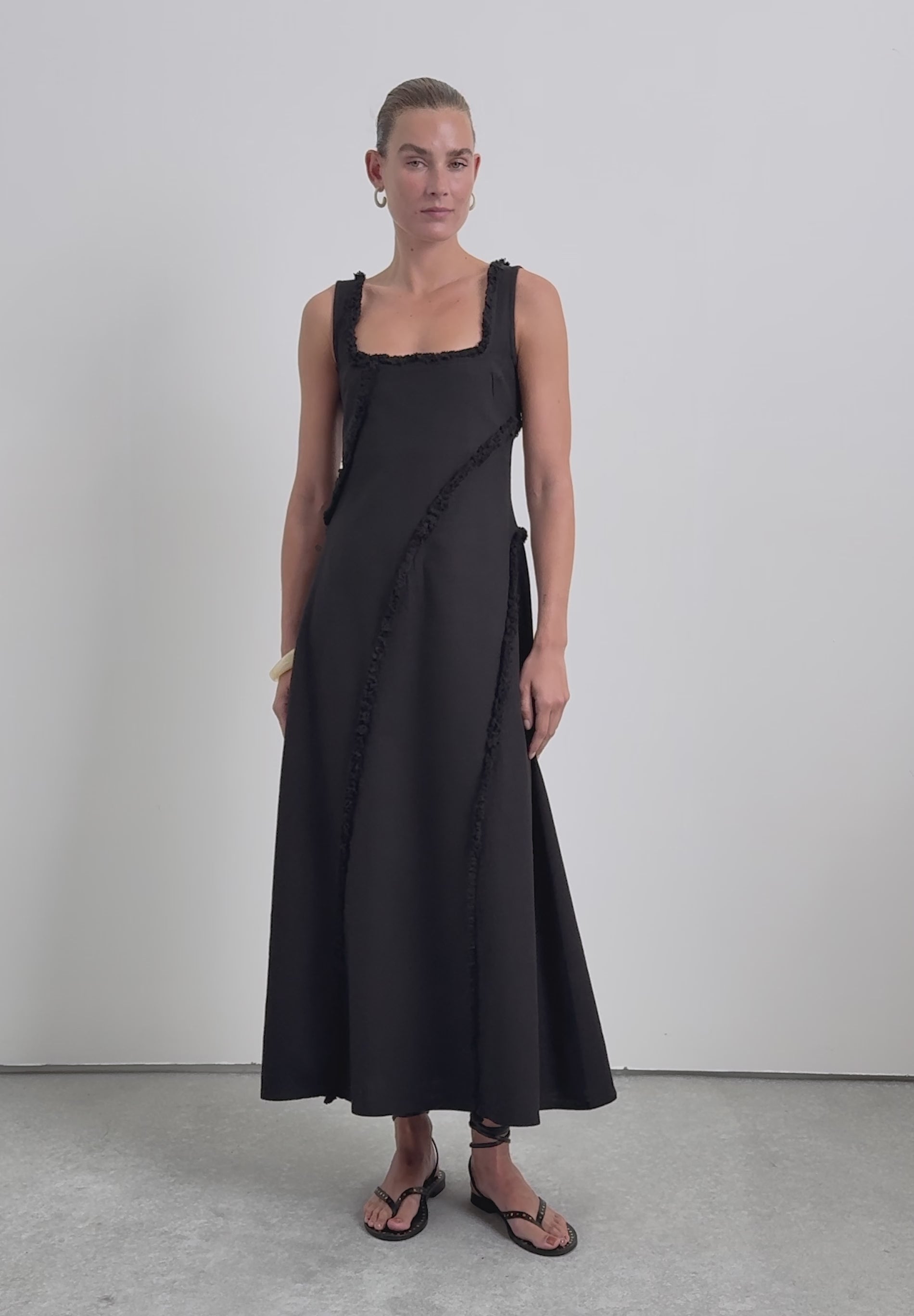 Midi dress made of 100% organic BCI cotton. Straps. Square-cut neckline. Topstitched fringe detail.