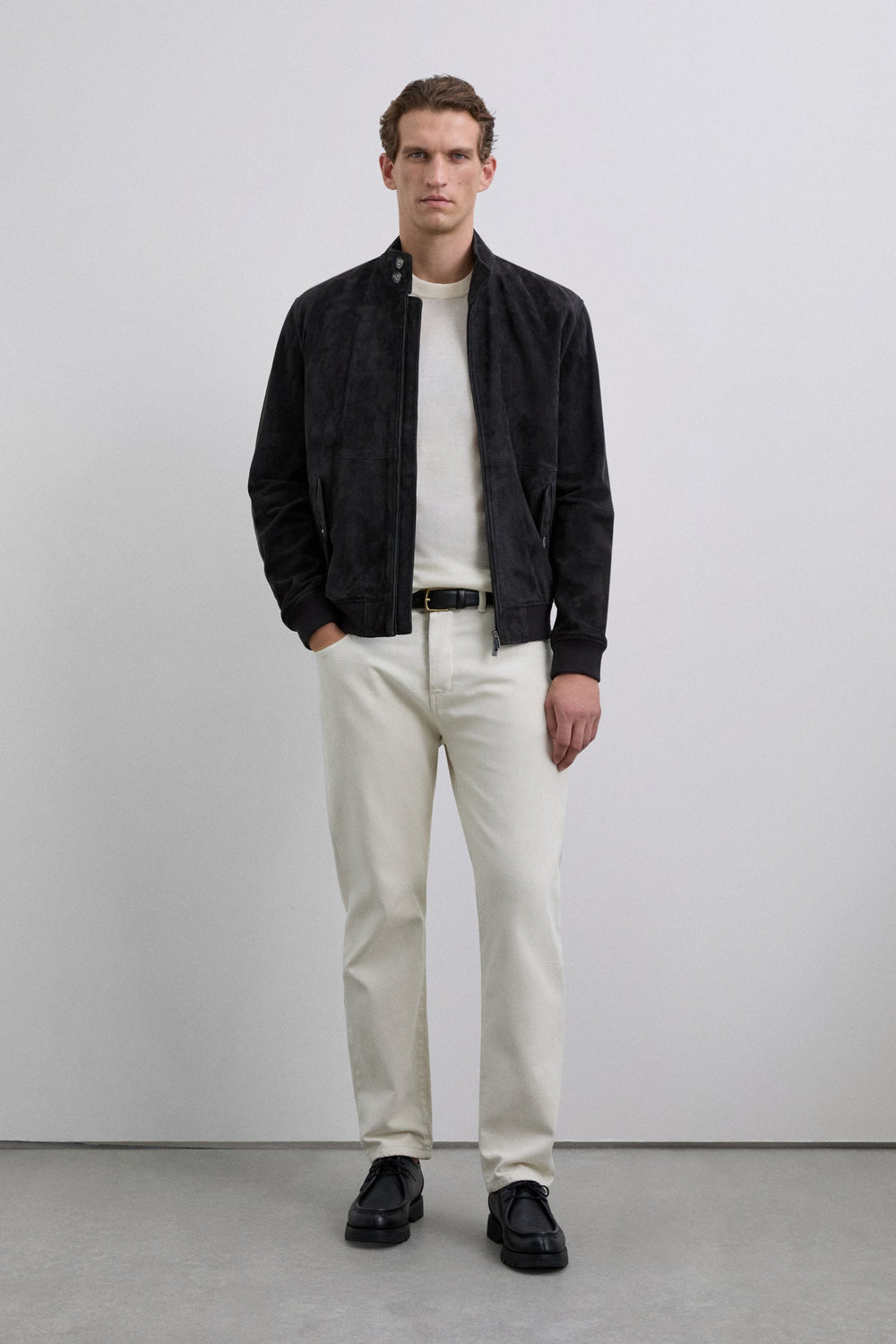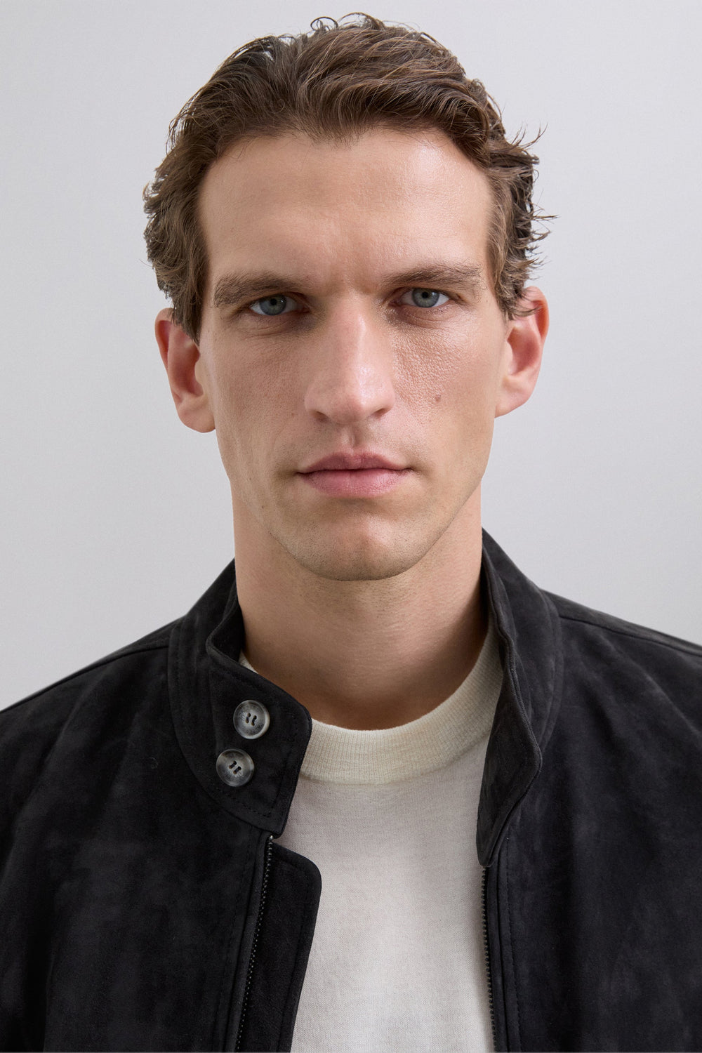 Jacket made of 100% goatskin. Double slider zip. Ribbed cuffs and waist. Two side pockets with button fastening. Two button fastening collar.
