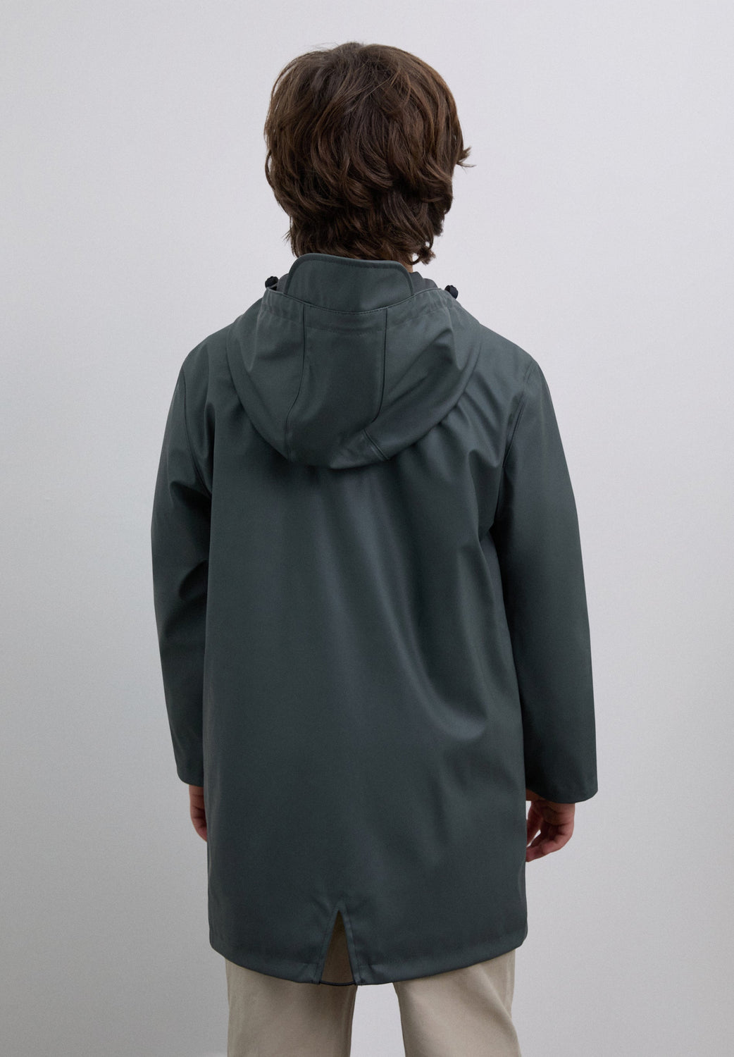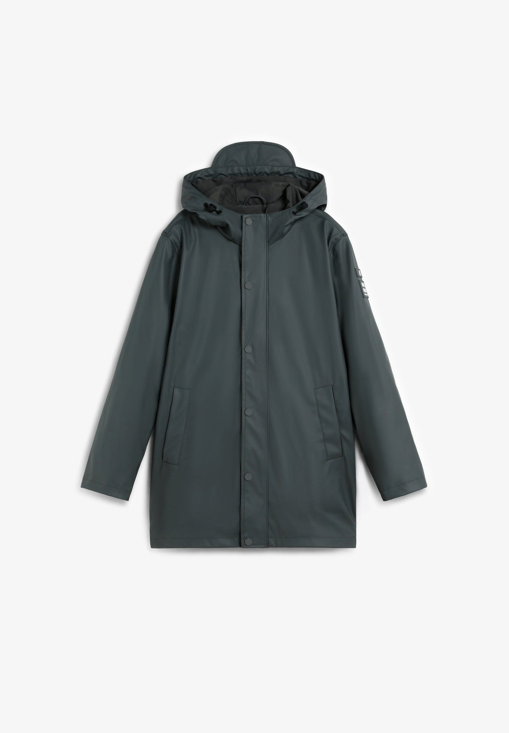 Waterproof parka with adjustable hood. Side pockets with placket and snap button. Synthetic lining. Rubber logo patch detail and skull. Button fastening. Long sleeves.