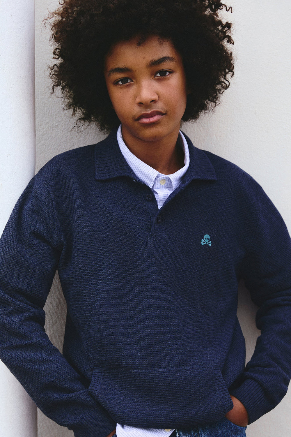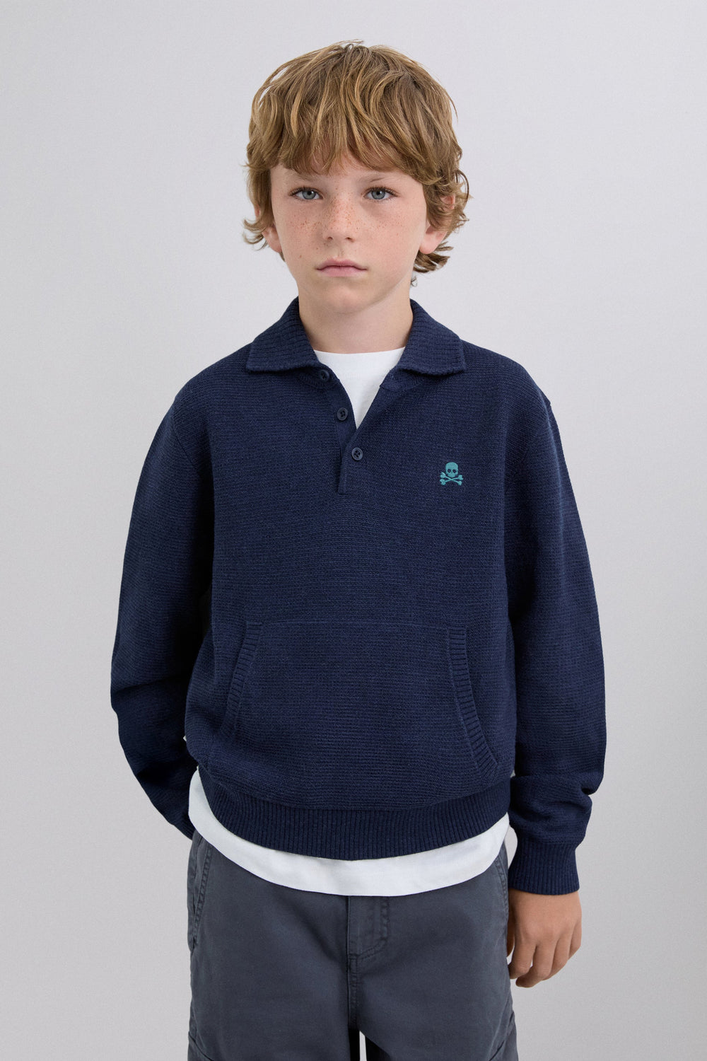 Knit sweater. Polo shirt collar. Long sleeves. Buttoned collar. Contrast embroidered logo.