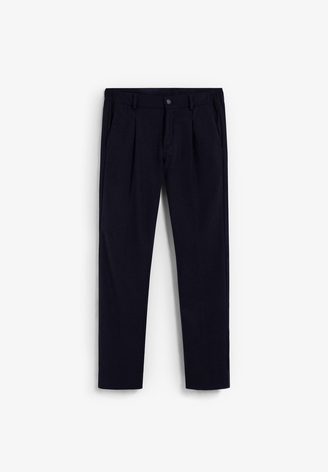 Darted trousers made of a wool blend. Regular fit. Front button and zip fastening. Belt loops. Side and back pockets.