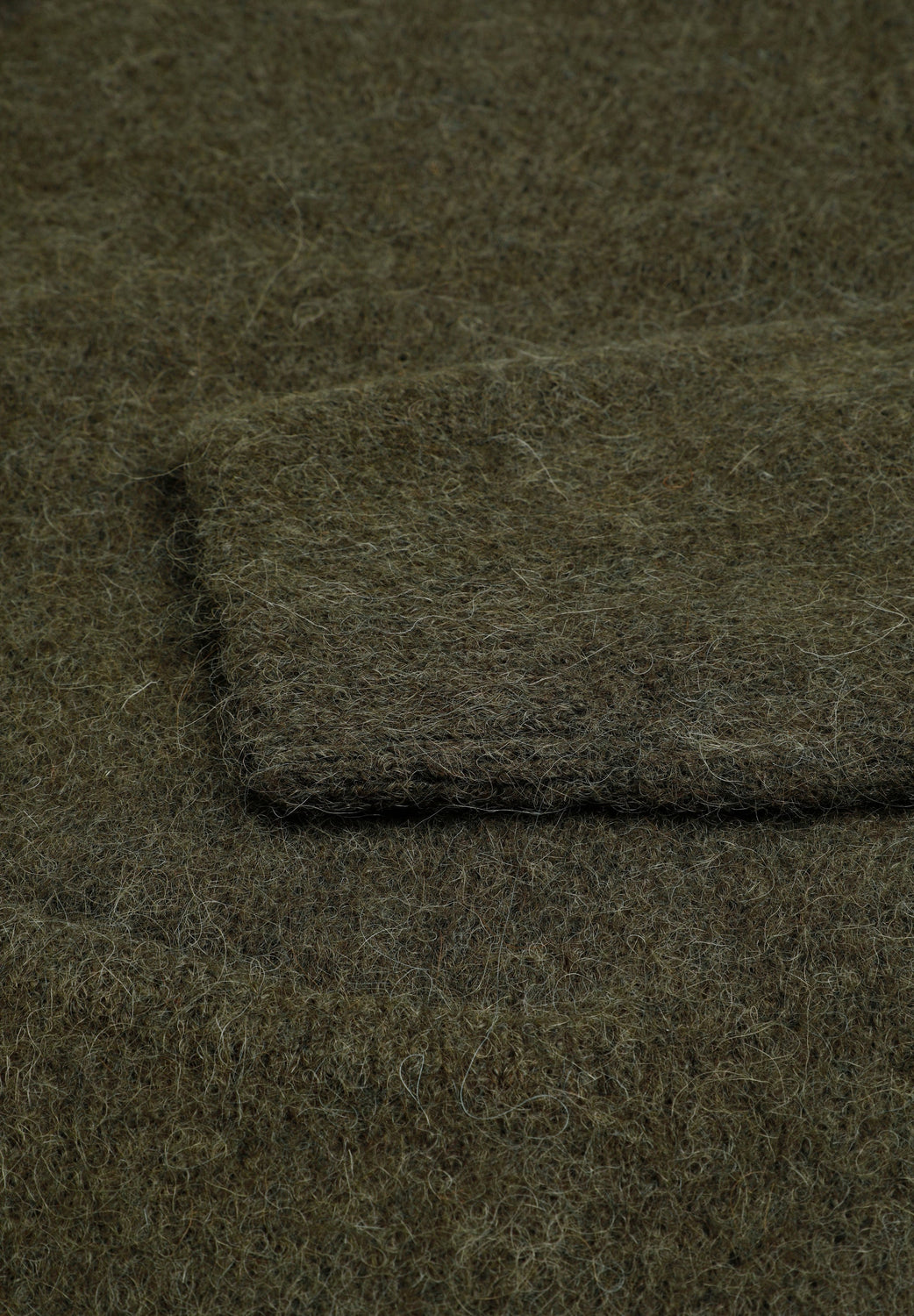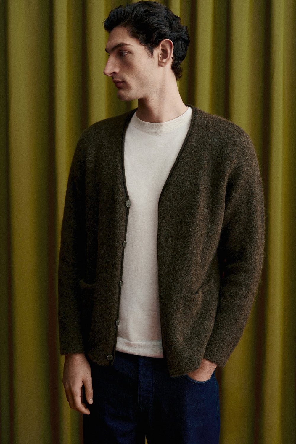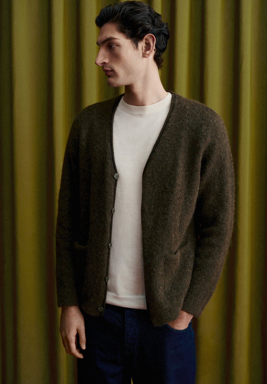 Alpaca vest. V-hals. Lange mouwen. Knoopsluiting voor. Twee zakken aan de voorkant. Label met logo aan de binnenkant.