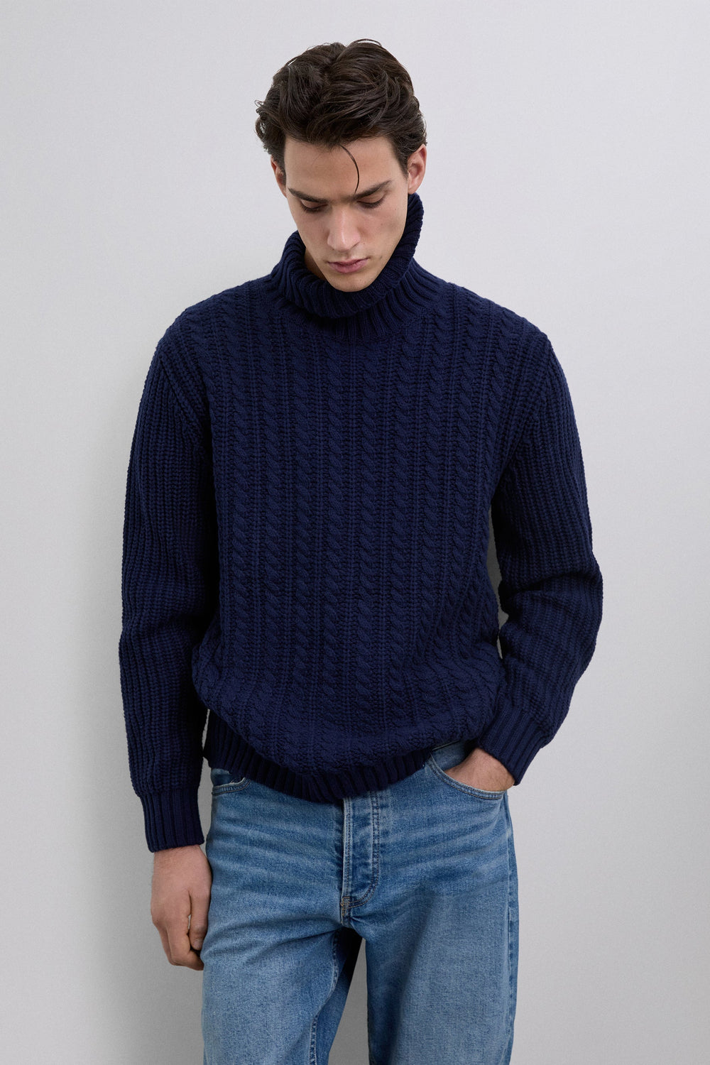 Gevlochten tricot trui. Hoge kraag. Lange mouwen. Regular fit.