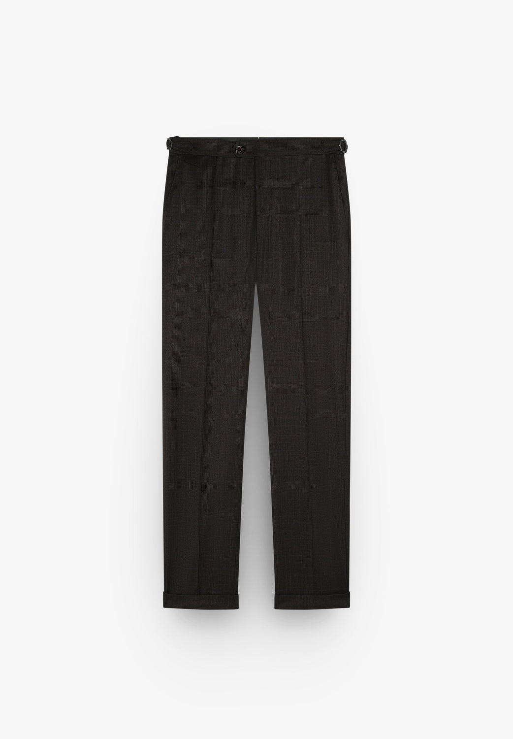 Traje marrón confeccionado en 100% lana. Regular fit. Americana sin armar con forro, cuello con solapas punta de lanza y cierre con botones. Manga larga terminada en botones practicables y uno cerrado y bolsillos de vivo. Pantalón recto con cierre con botón prologando en cinturilla y botones. Ceñidores laterales y botón para tirantes. Bajo con vuelta