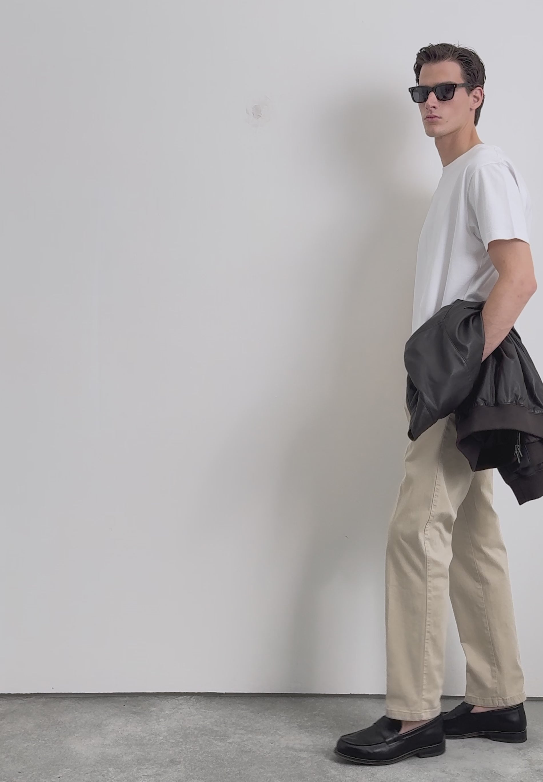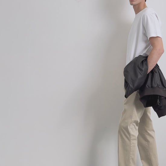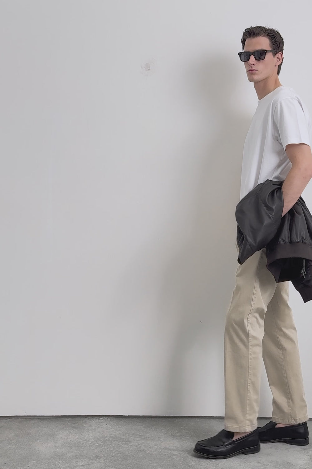 Chino trousers made of a slightly stretch cotton fabric. Loose fit with darts. Concealed zip fastening with placket and button at the waist. Side and back pockets. Belt loops.