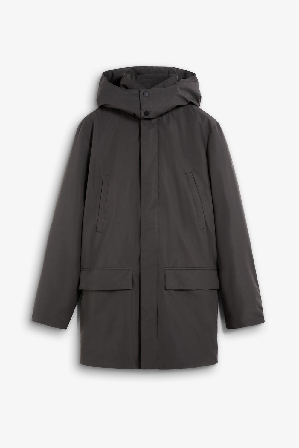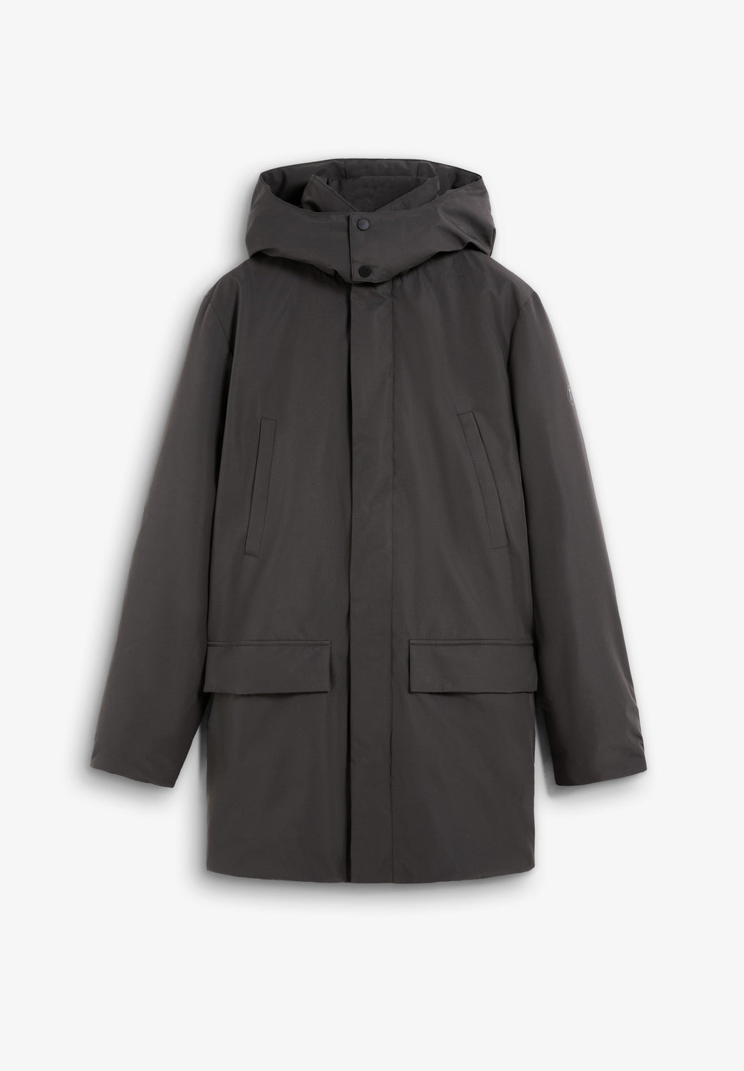 Hooded technical parka. Long sleeves. Four front pockets, two slanted top pockets and two lower flap pockets. Adjustable zip fastening on the cuffs.