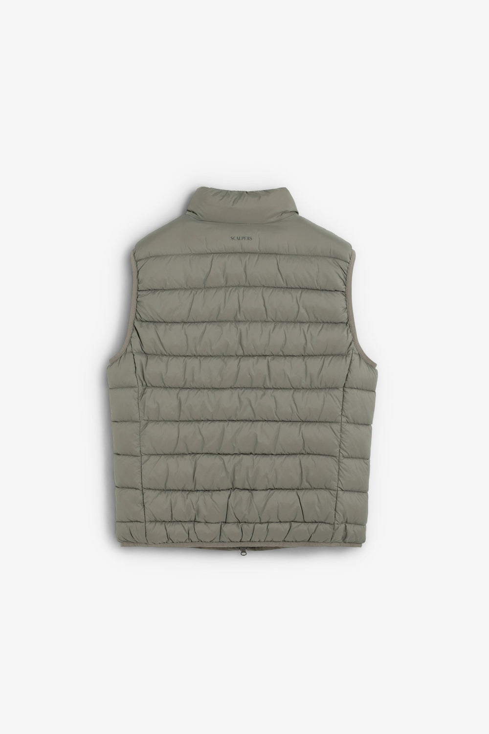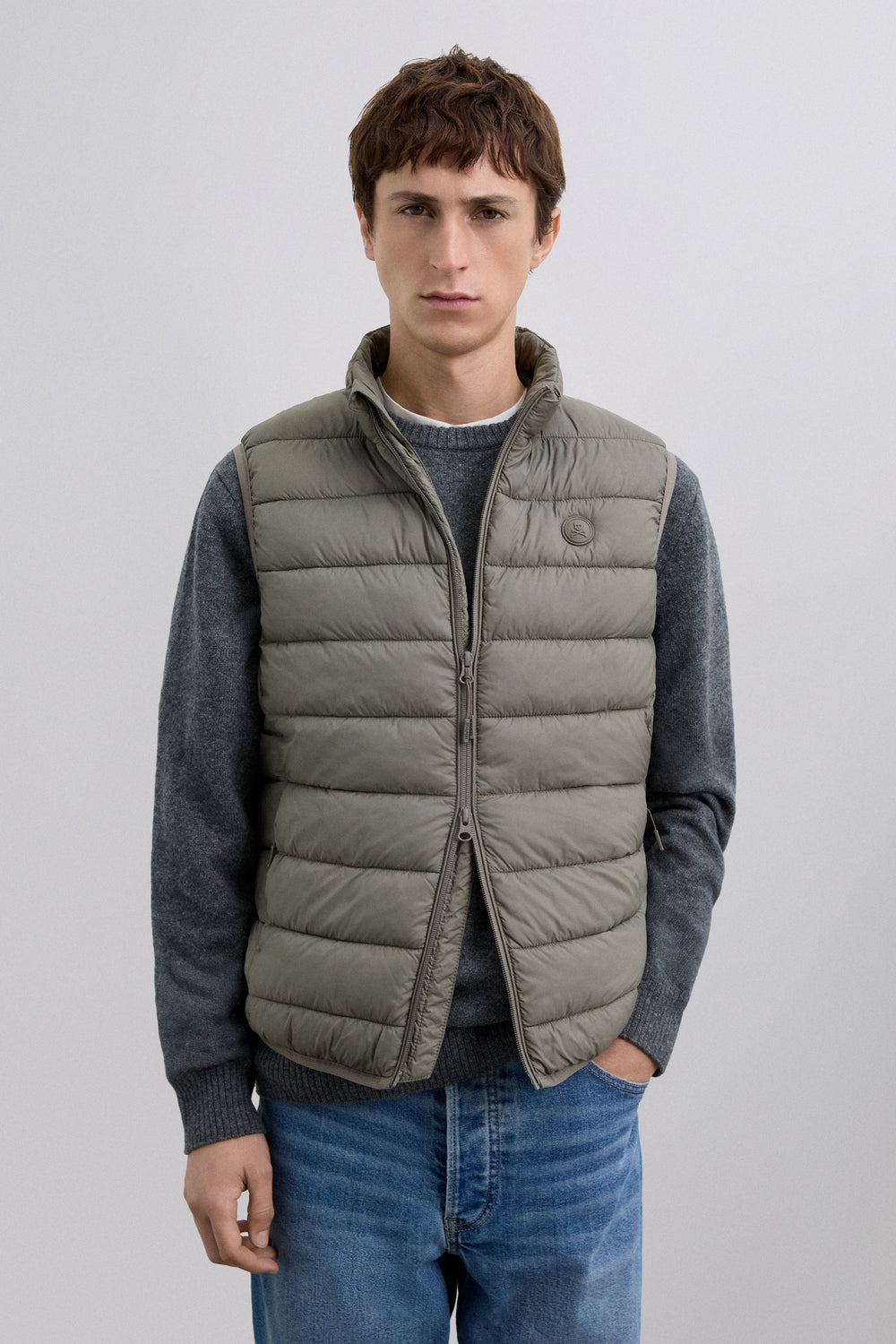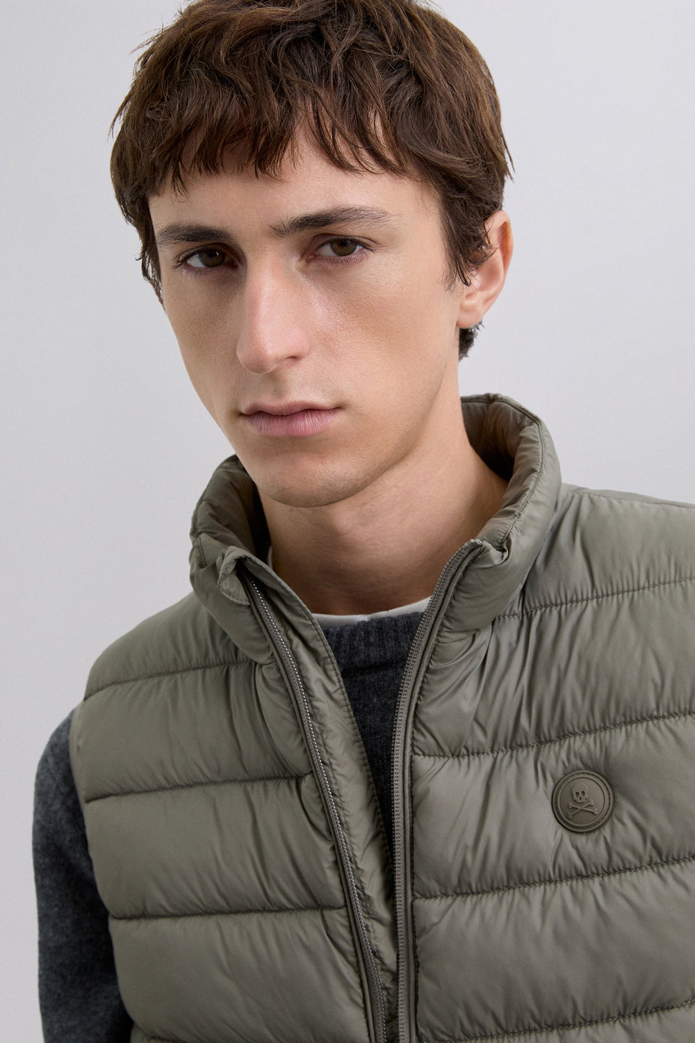 Puffer vest. Water repellent. Inner lining made of technical fabric. Concealed side pockets with fleece lining. Engraved double slider zip fastening. Rubberised patch with matching logo on chest.