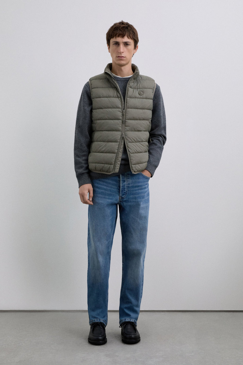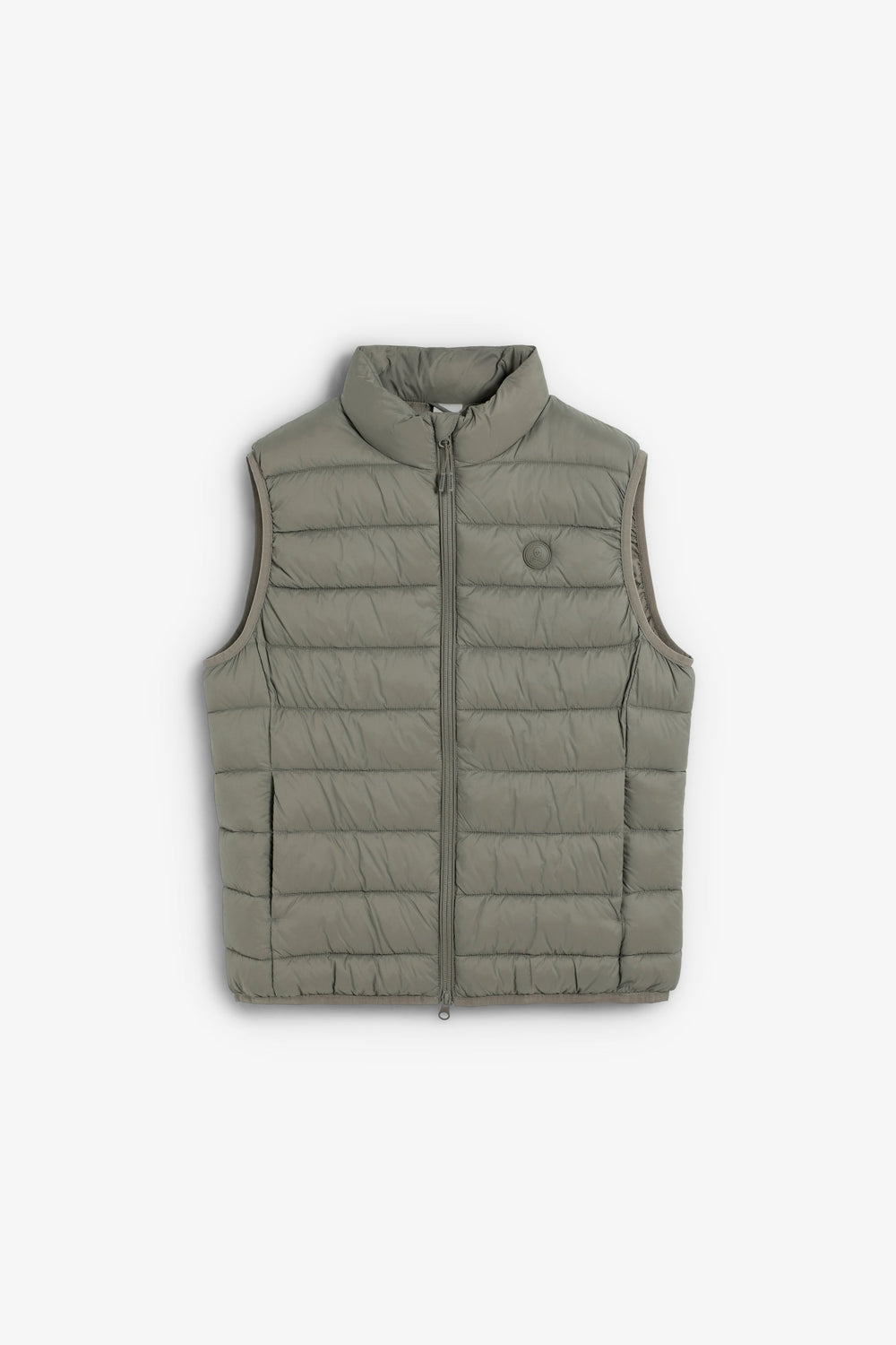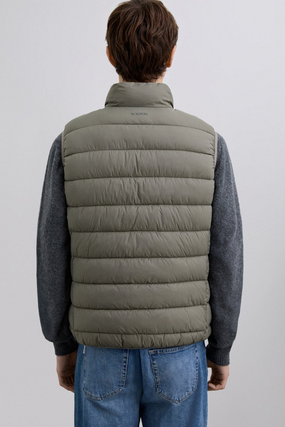 Puffer vest. Water repellent. Inner lining made of technical fabric. Concealed side pockets with fleece lining. Engraved double slider zip fastening. Rubberised patch with matching logo on chest.