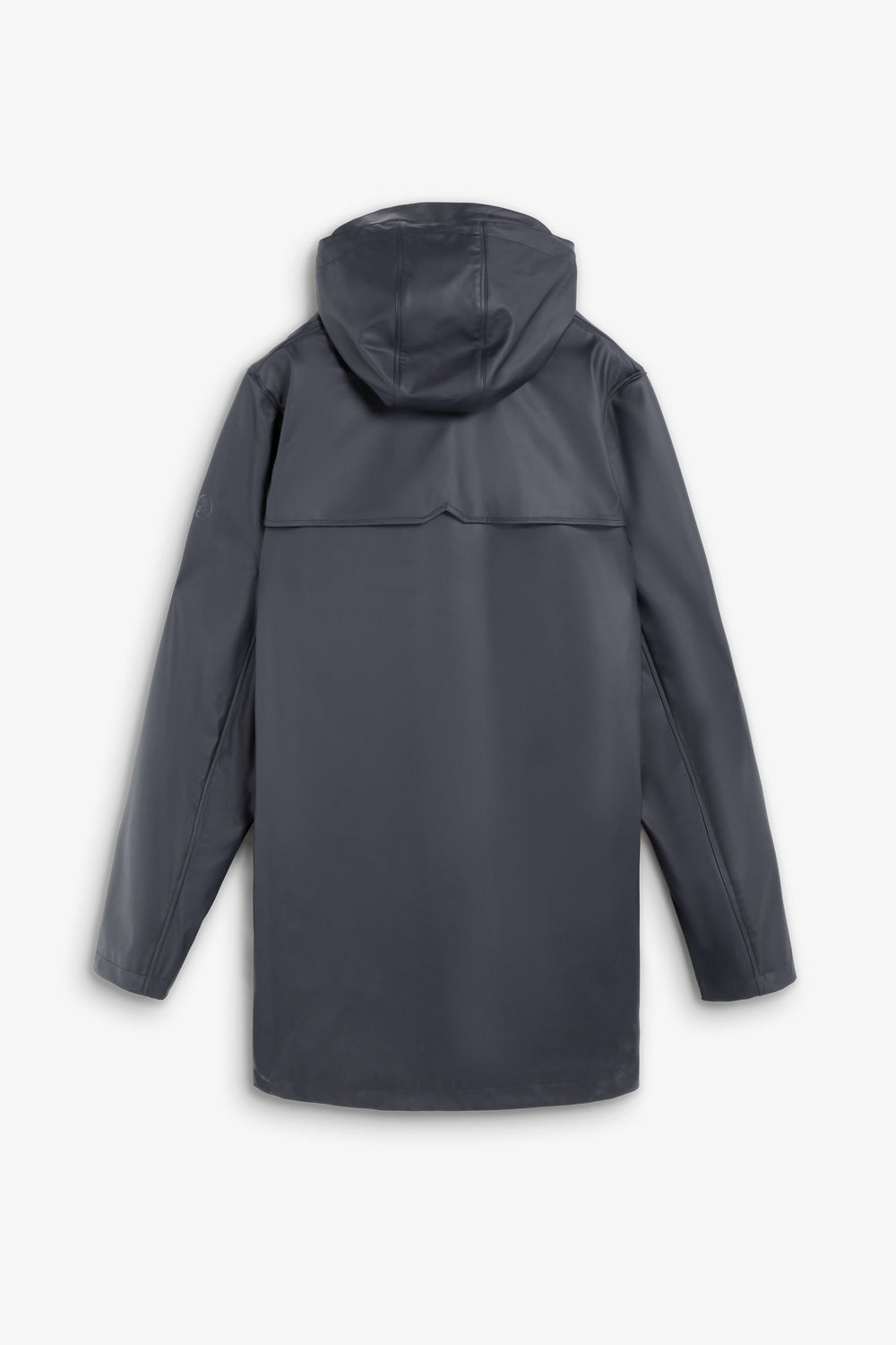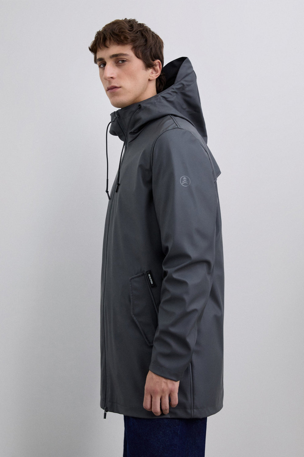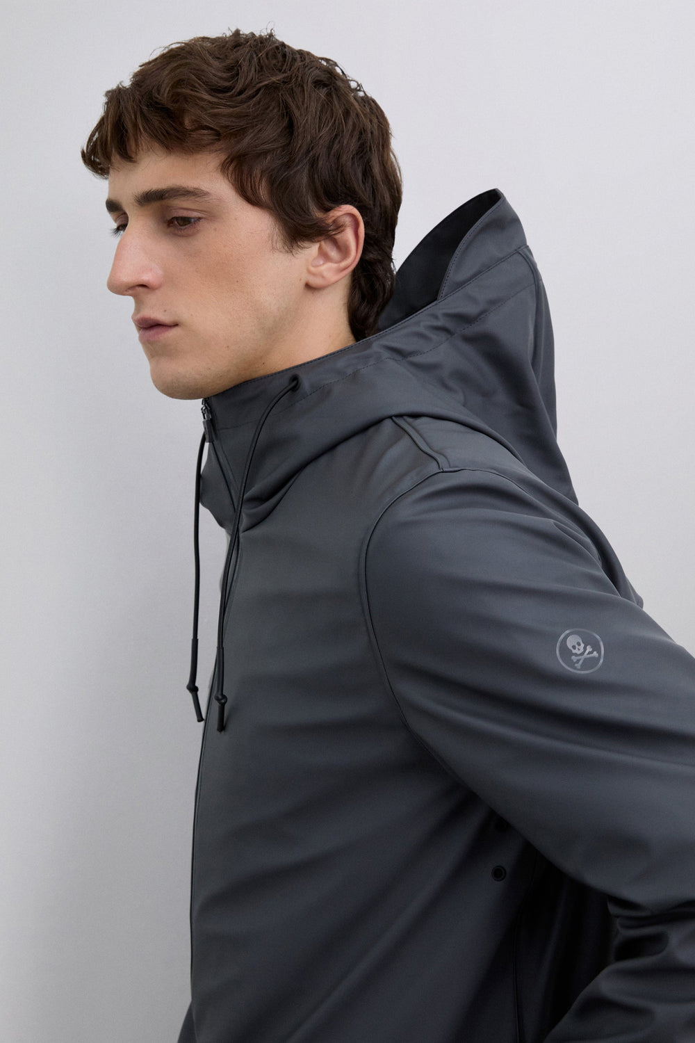 Waterproof jacket. Collar with an adjustable drawstring hood. Double slider thermo-sealed zip fastening. Long sleeves. Side pockets with placket and snap button. Contrast rubberised logo detail on lower front and matching skull on zip.