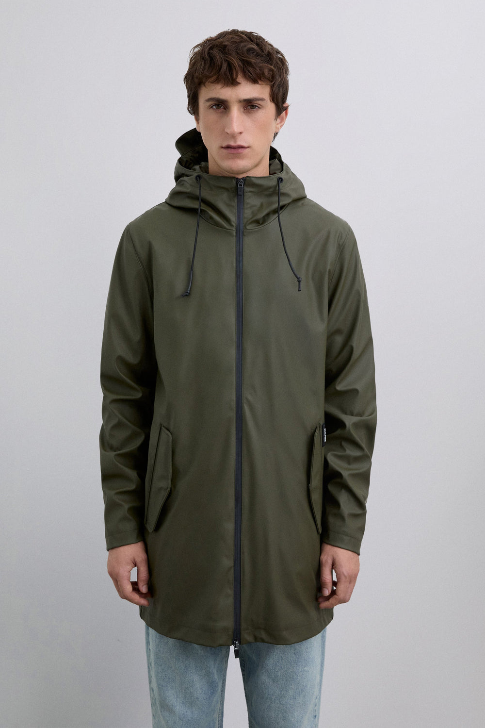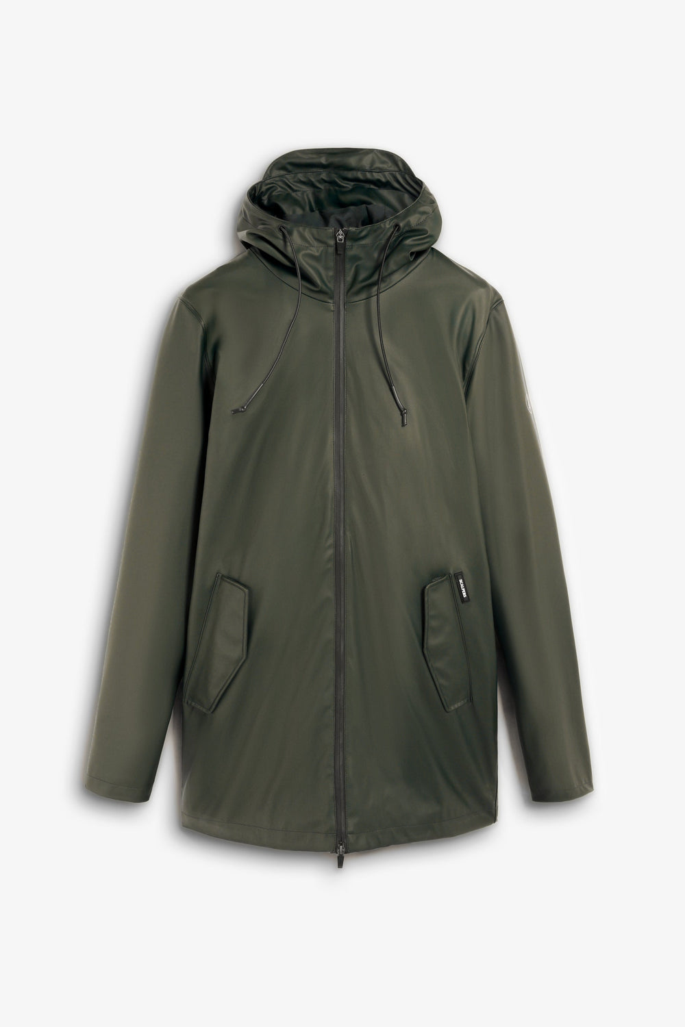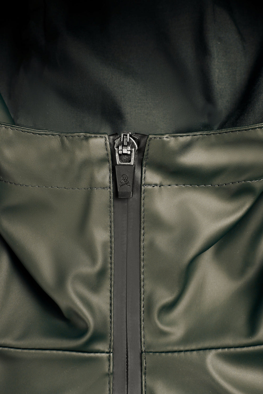 Waterproof jacket. Collar with an adjustable drawstring hood. Double slider thermo-sealed zip fastening. Long sleeves. Side pockets with placket and snap button. Contrast rubberised logo detail on lower front and matching skull on zip.