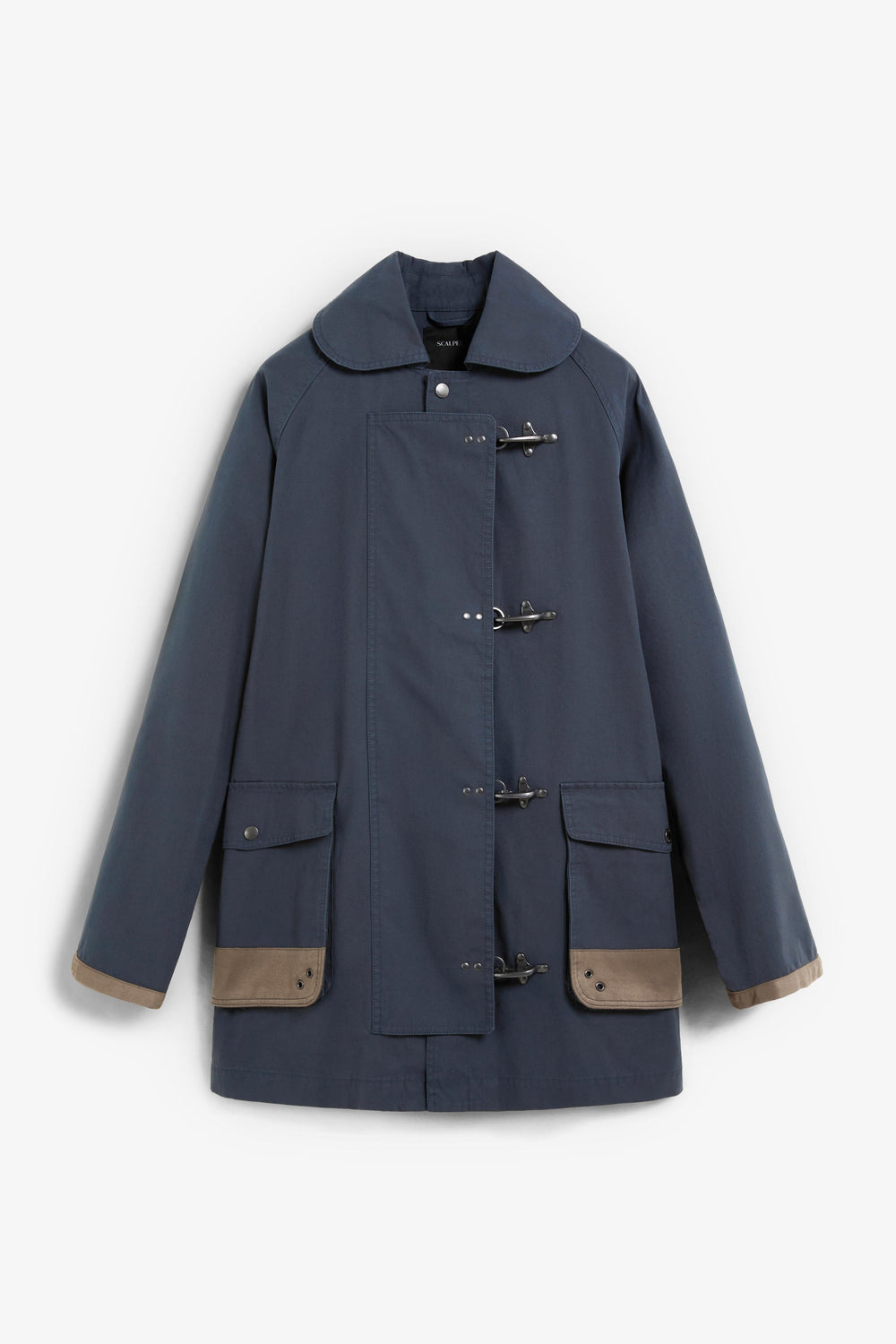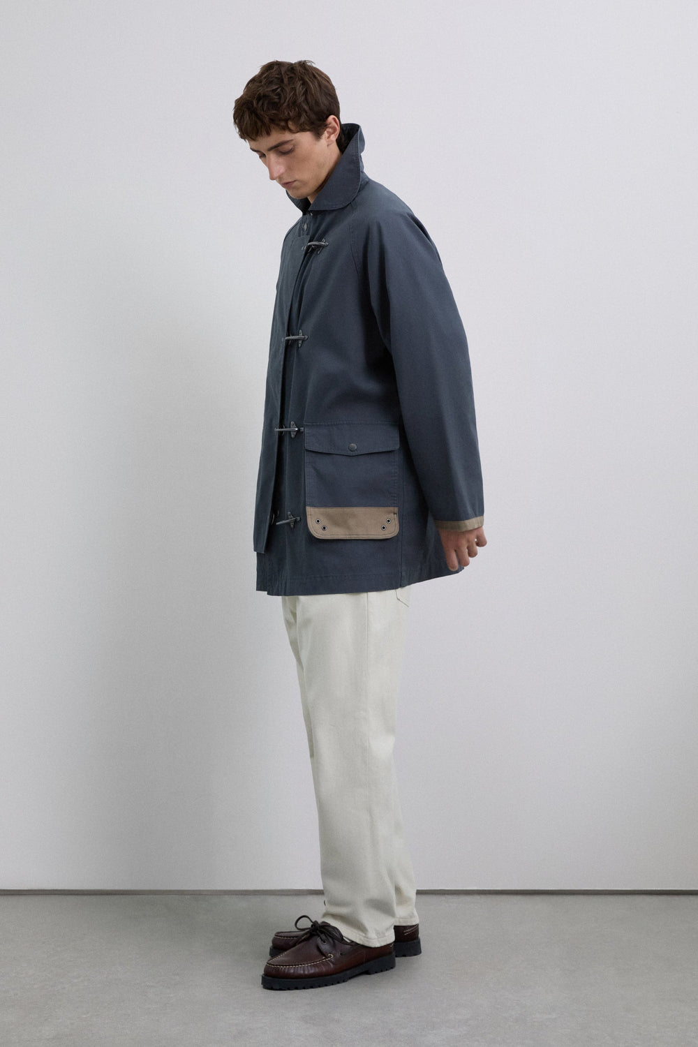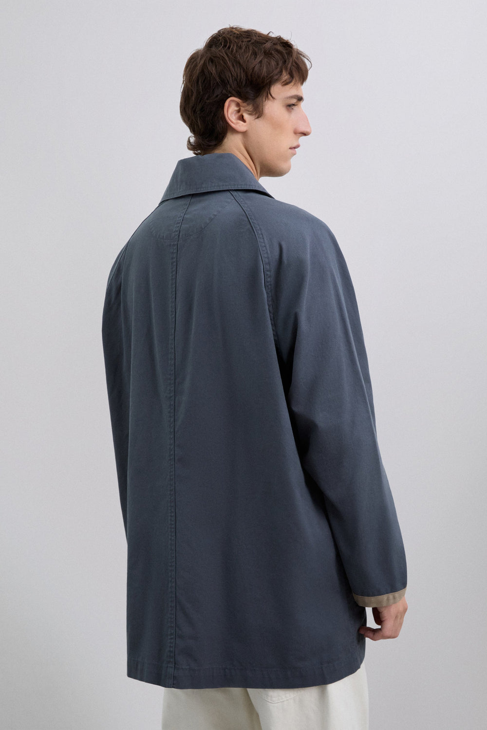 Jacket made of 100% organic cotton. Front buttoned pockets. Side pockets with eyelet details. Oversize design. Rounded shirt-style collar. Raglan sleeves. Fastens with snaps and toggles. Suede piping around the sleeve opening and on the lower edge of the pocket.
