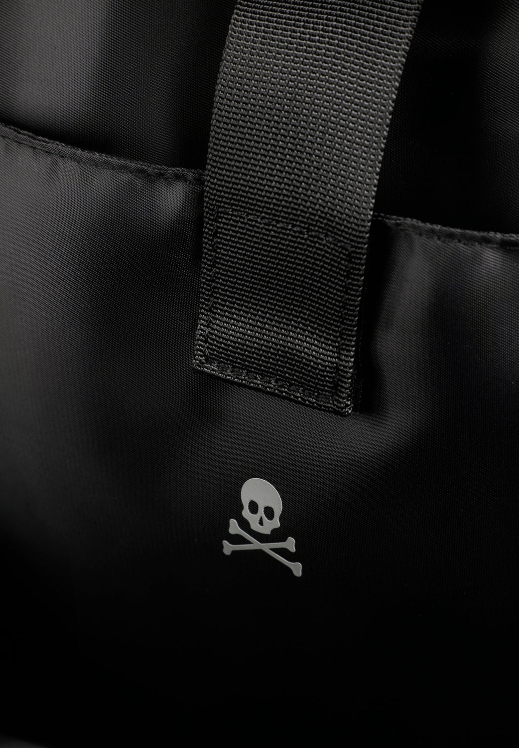 Backpack made of a technical fabric. Double exterior front pocket. Adjustable buckle fastening. Skull detail on front and back print. Top handle. Side and back fastening adjustments. Padded reinforced back.