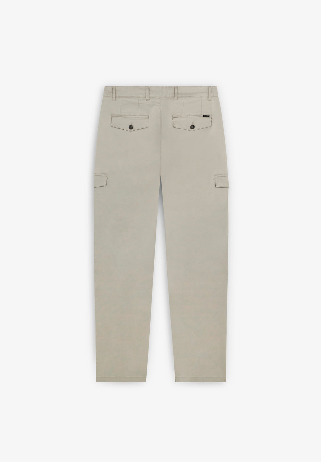 Cargo trousers made of BCI cotton. Slim fit. Two front pockets, back pockets with button fastening and side flap pockets. Belt loops and button and zip fastening. Embroidered logo on the back pocket.