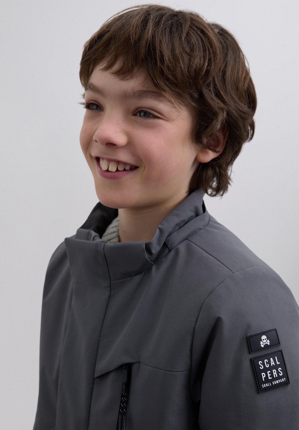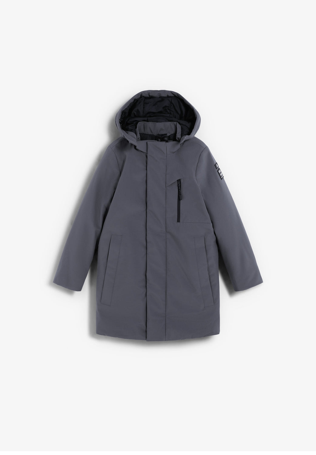 Long parka made of recycled technical fabric. Regular fit, hood and fastening with thermo-sealed zip and placket. Long sleeves and thermo-sealed zip pockets. Side rubberised patch.