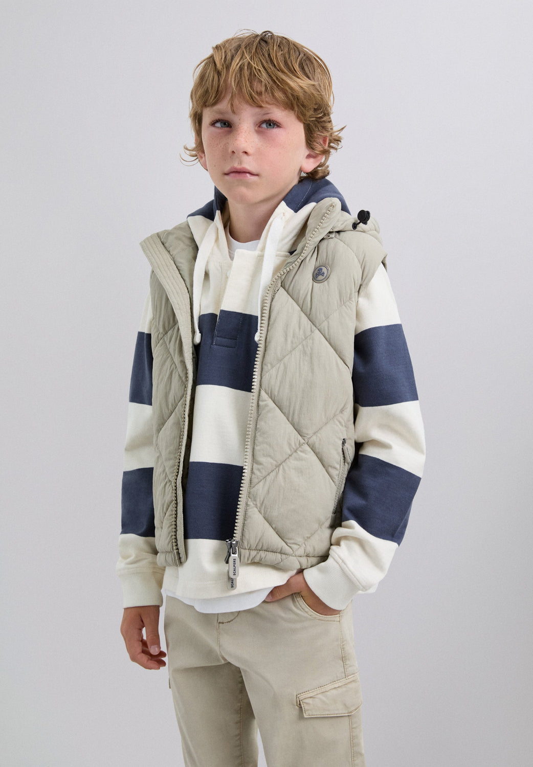 Heavy-duty padded waistcoat with adjustable hood. Double slider zip fastening. Rubberised skull detail on chest. Zip pockets and an inner pocket