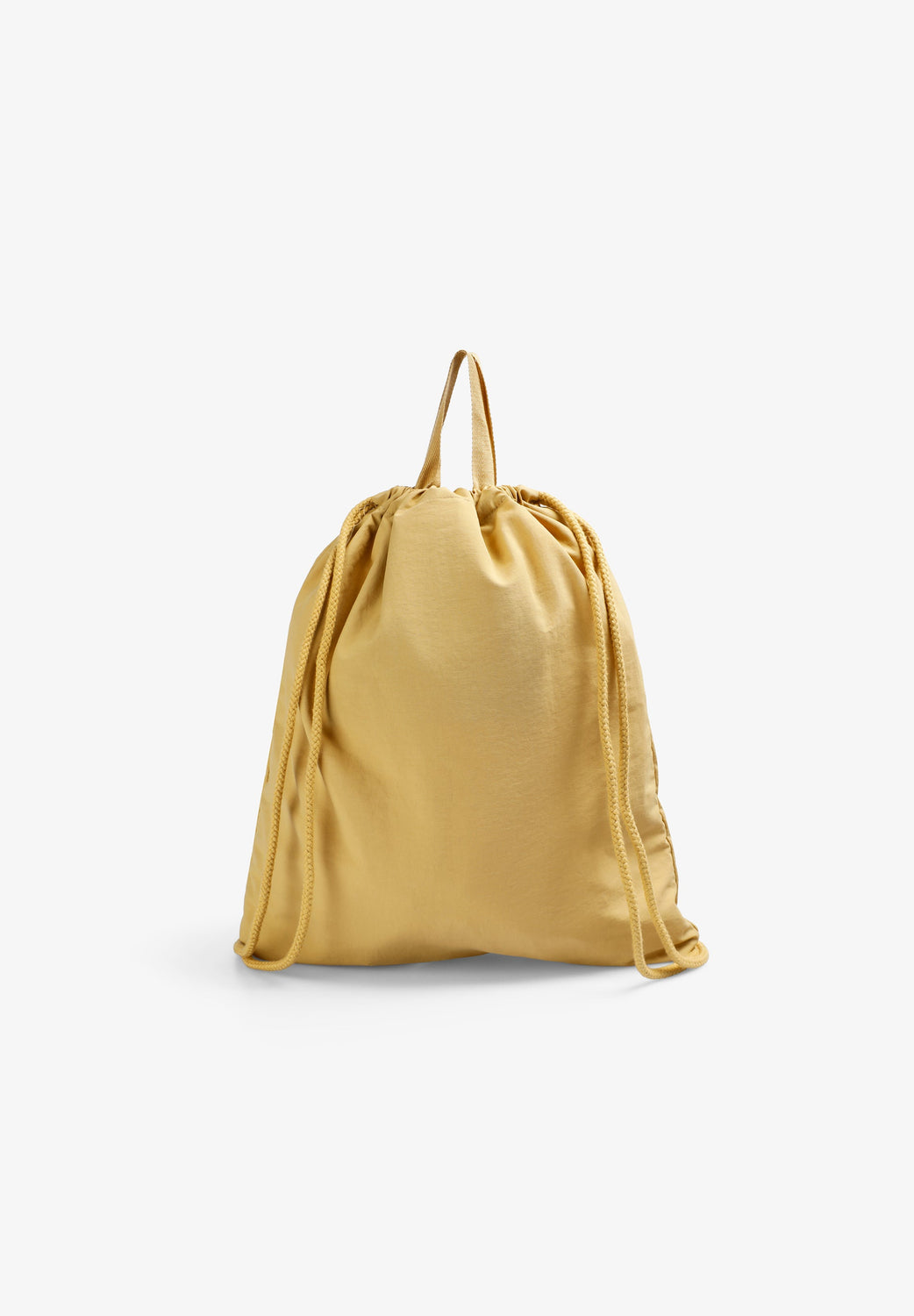 Lightweight synthetic bag. Handle. Double handle on back. Front logo print.