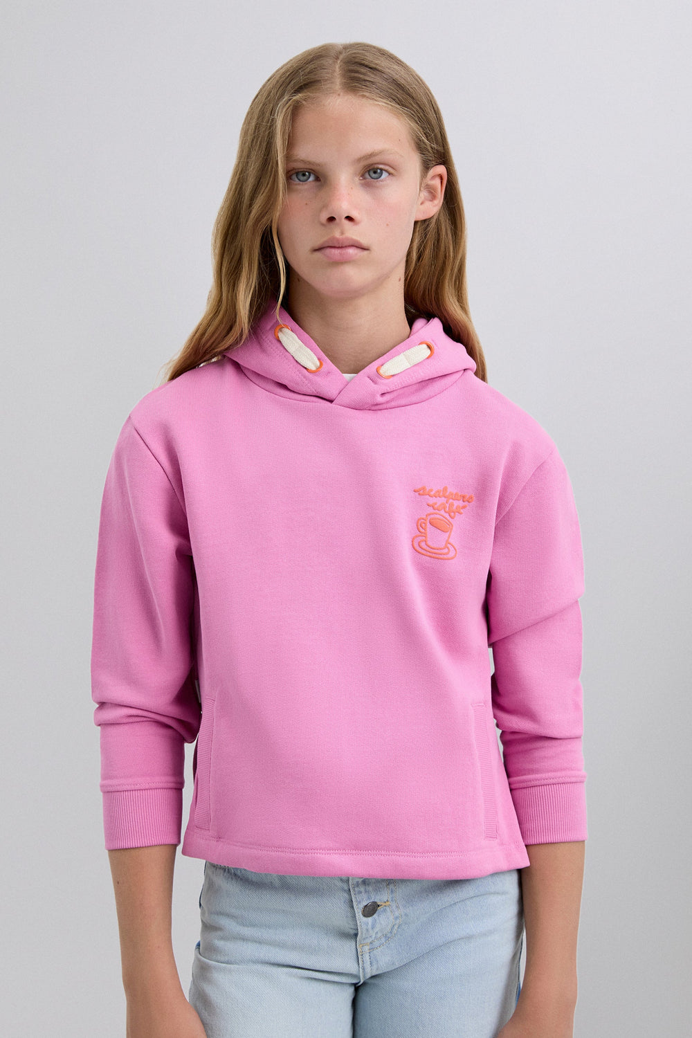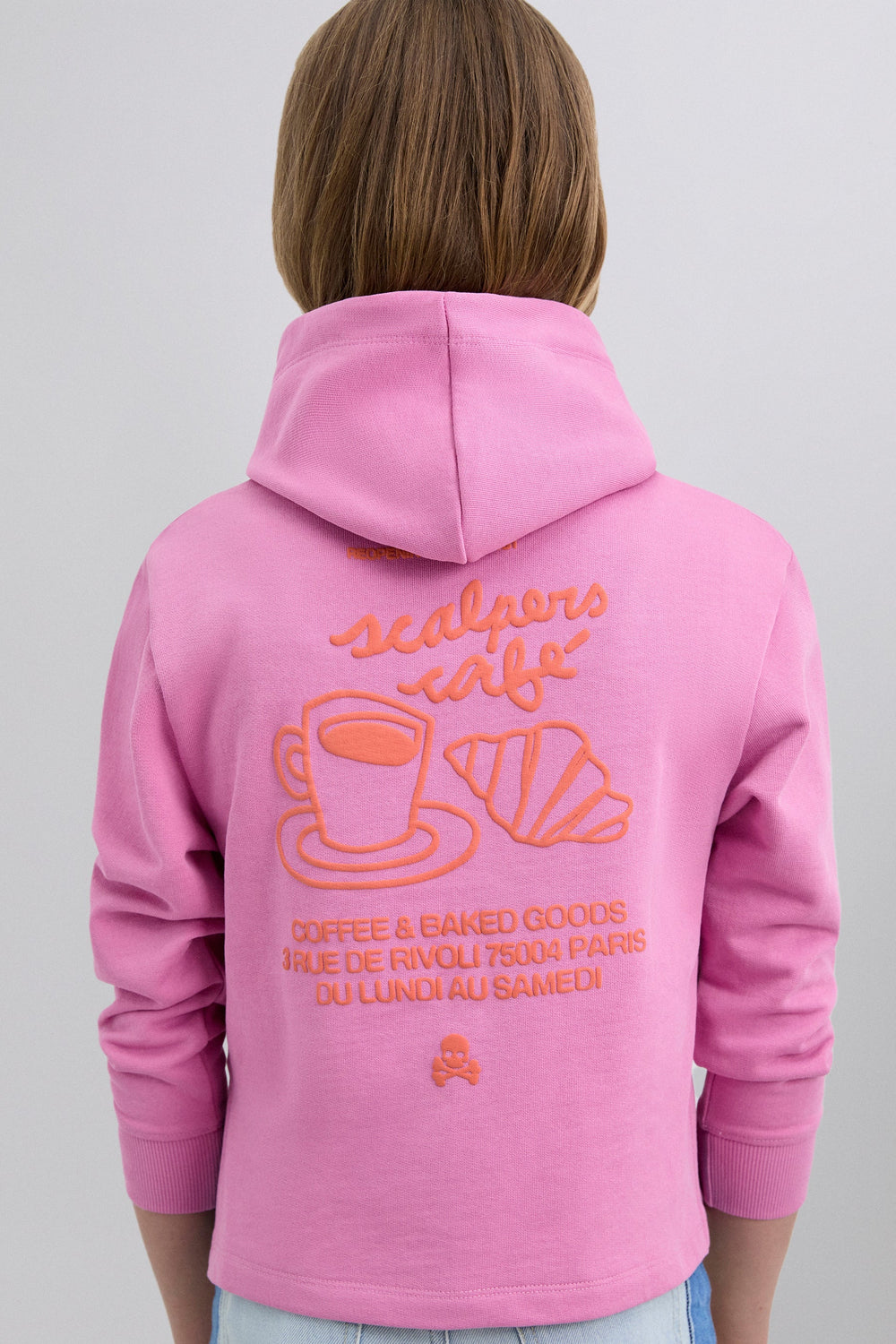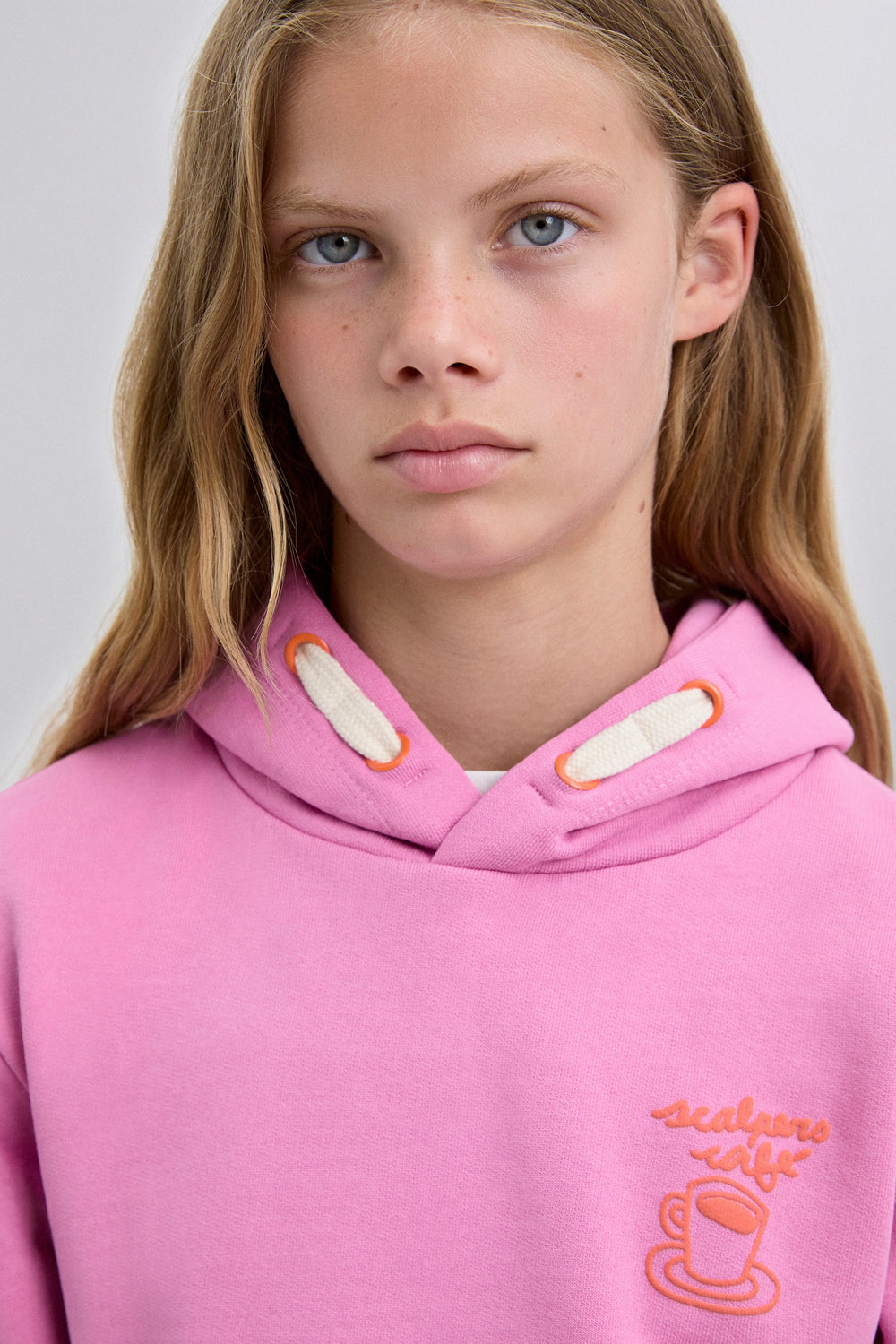Sweatshirt with adjustable hood made of 100% BCI cotton. Long sleeves with cuffs and front pouch pockets. Print detail on the chest and back.