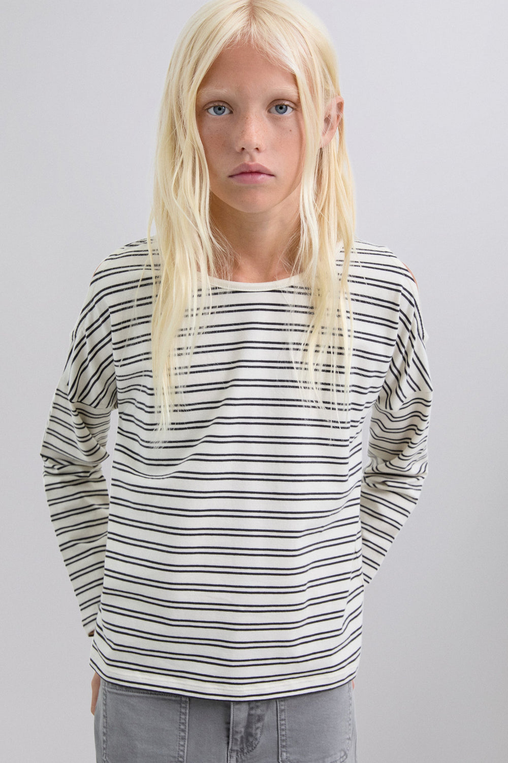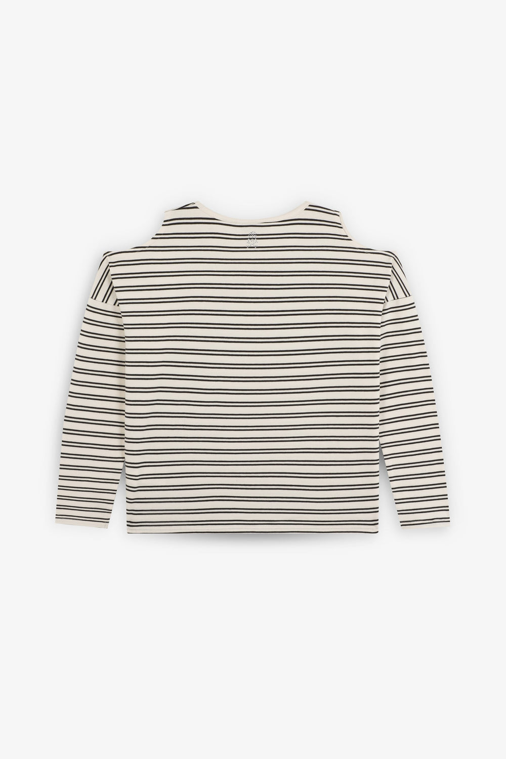 T-shirt made of BCI cotton. Regular Fit. Stripe print. Round neck. Long sleeve with opening at the shoulders. Studded skull detail on the back.