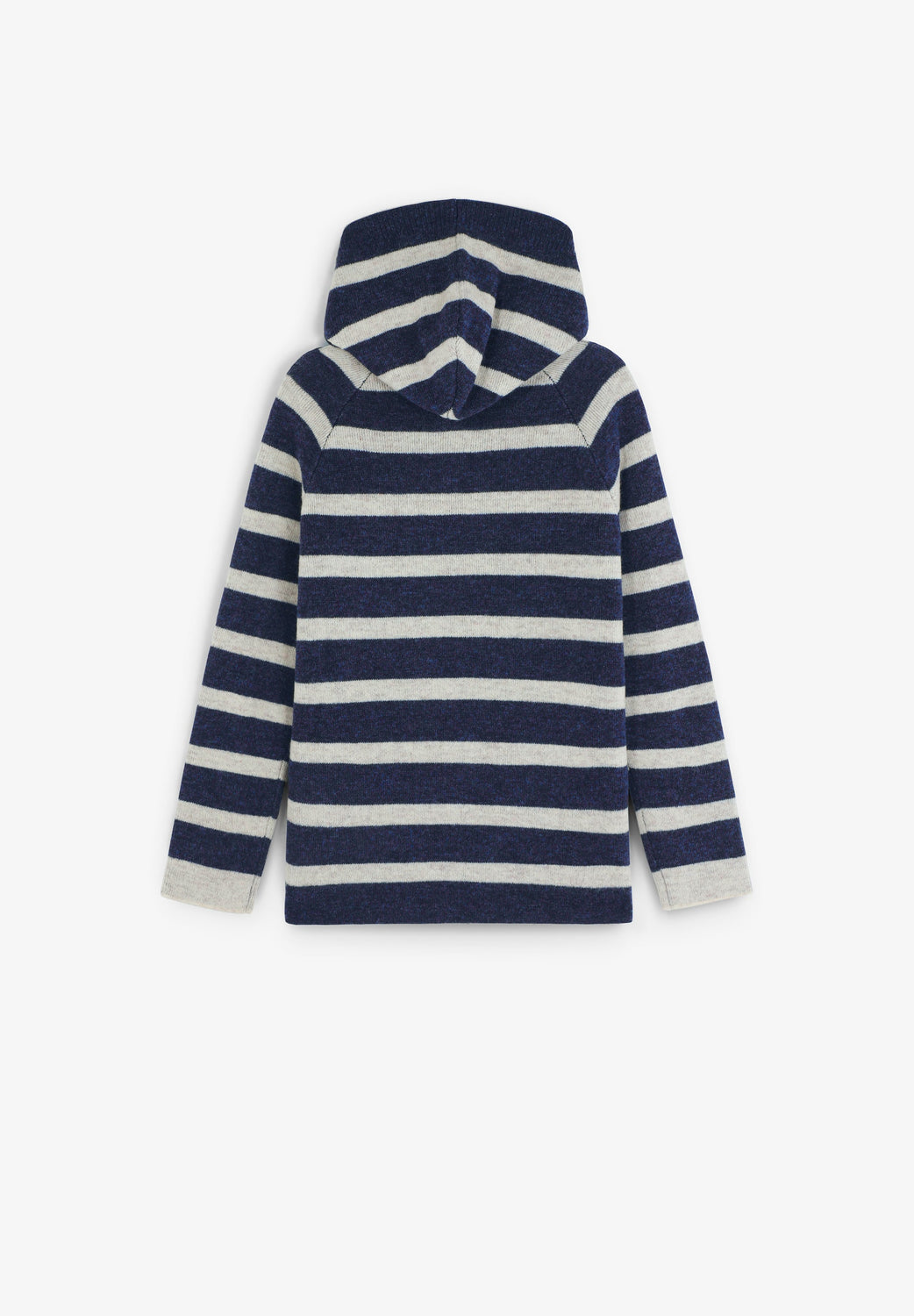 Knitted sweater with hood. Stripe print. Long sleeves. Contrast embroidered skull on the waistband.