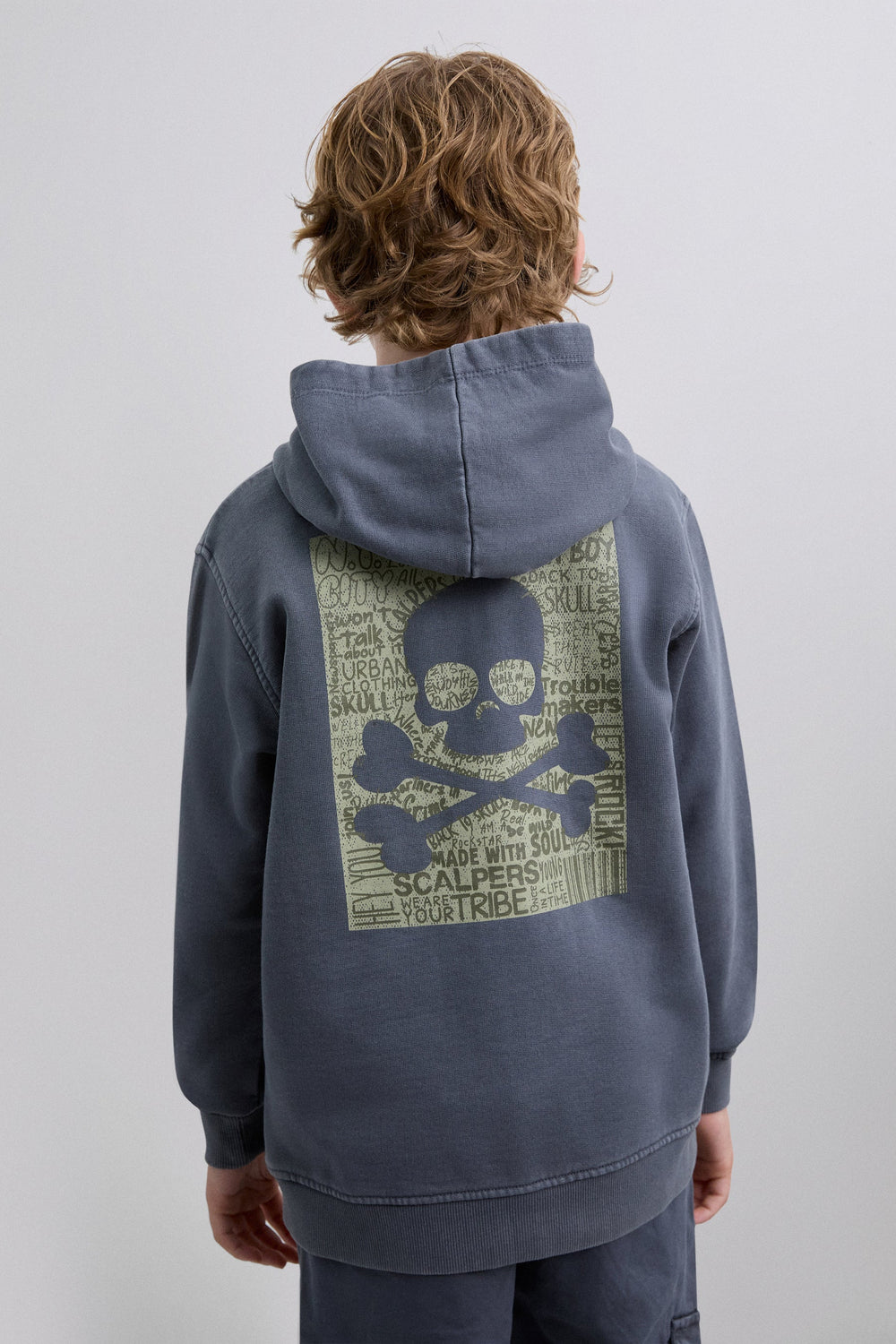 Sweatshirt with hood made of 100% BCI cotton. Print on chest and back. Long sleeves with ribbed cuffs. Front pouch pockets. Skull label detail on waistband.