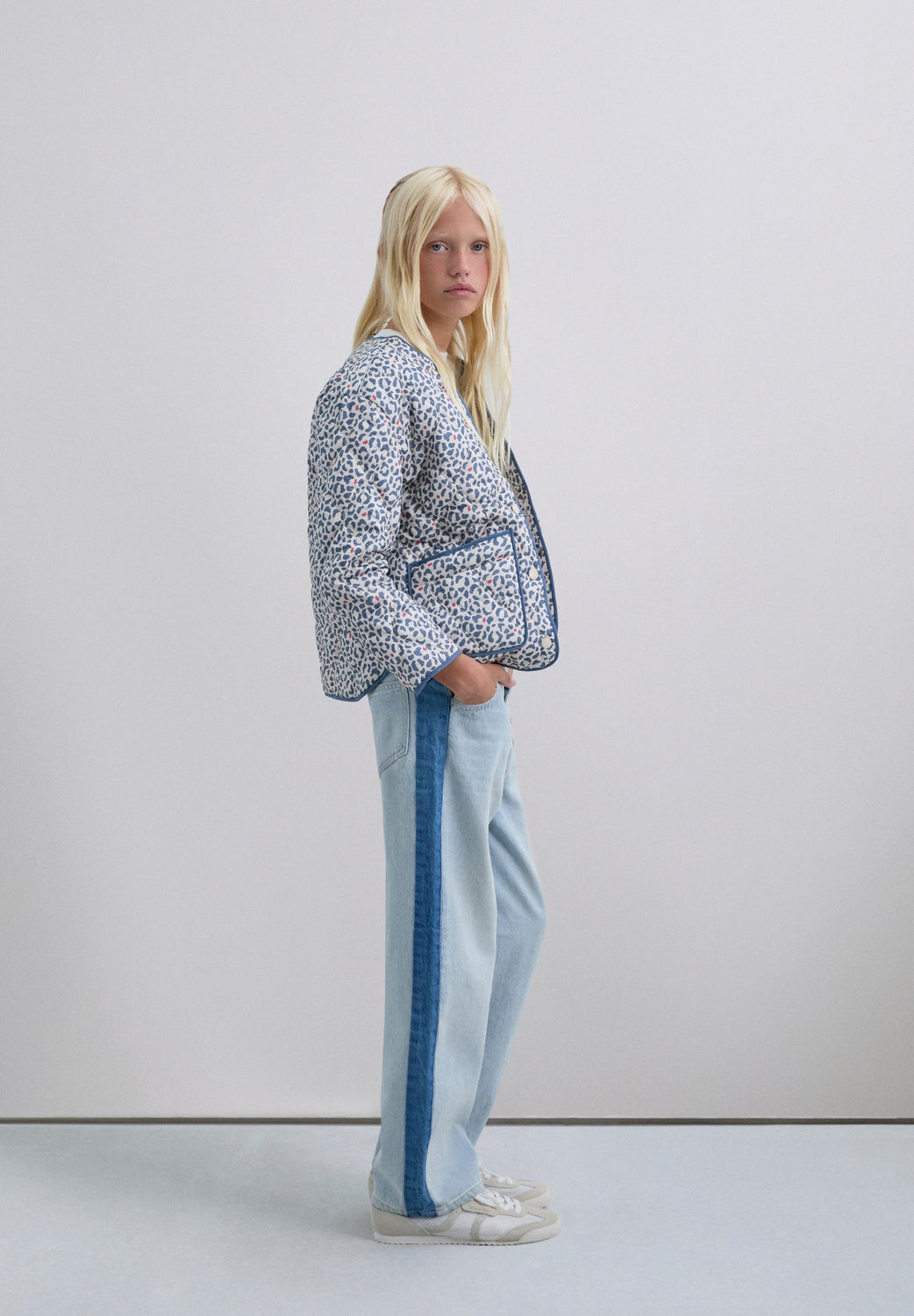 Puffer jacket made of a synthetic blend. Animal print. Button fastening. Slightly V-neck. Long sleeves. Two front pockets.