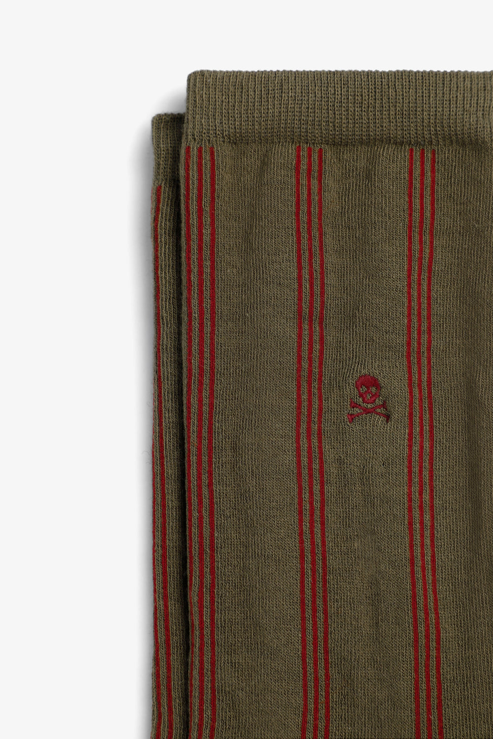 Over-the-calf socks made of a cotton blend. Contrast embroidered stripe pattern. Contrast embroidered logo on the top. Ribbed trim.