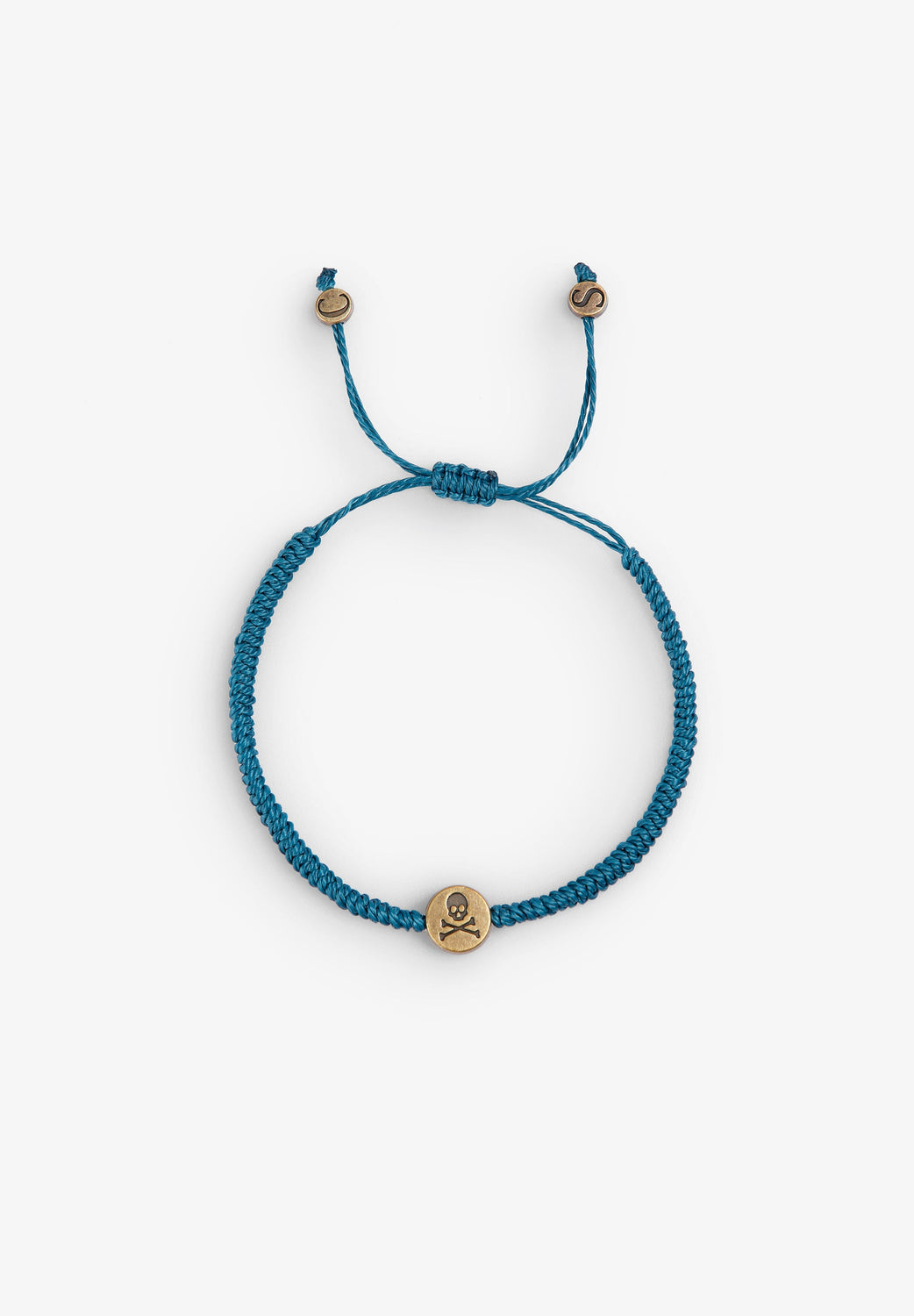 Braided bracelet made of cotton. Metal appliqués with logo. Adjustable wrist fastening with logo detail.
