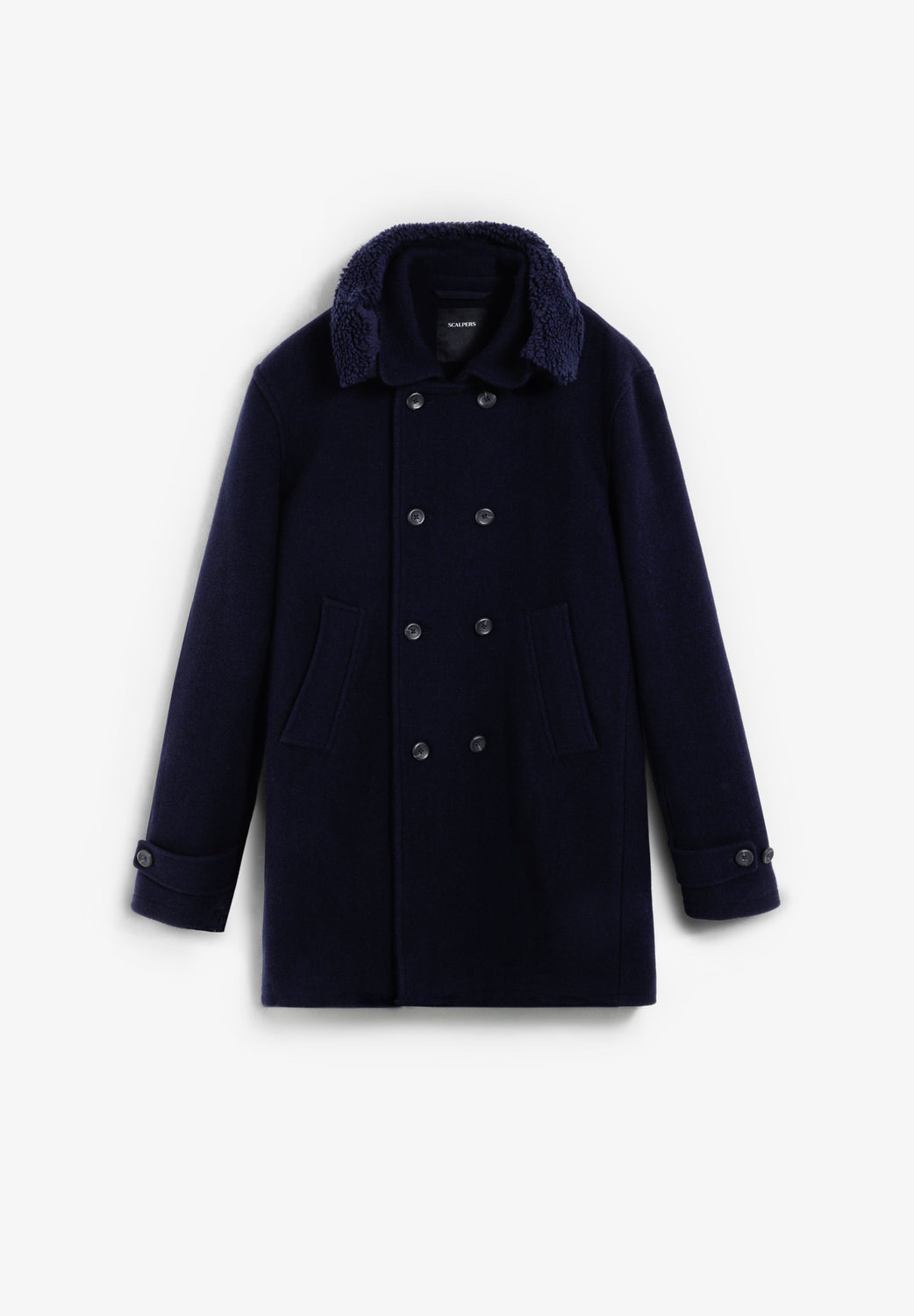 Double-breasted coat made of wool. Button fastening. Cuff detail with tab. Two large, slanted, front welt pockets. Inner pocket. Detachable detail on collar