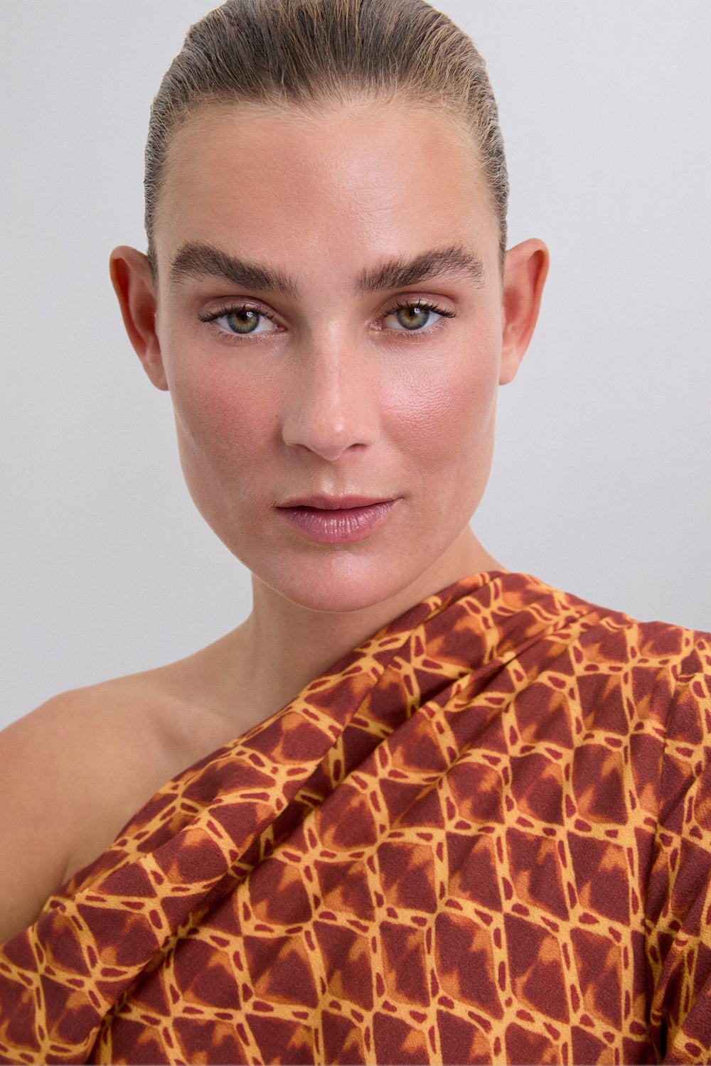 Print dress with long and short puffed sleeves with elasticated cuffs. Asymmetric neckline. Off-shoulder on one side. Slim fit.