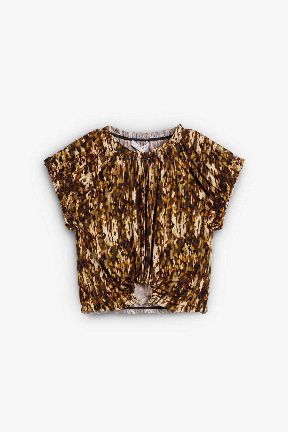 Printed top with metal buckle detail on the front. Short sleeve. Round neck.