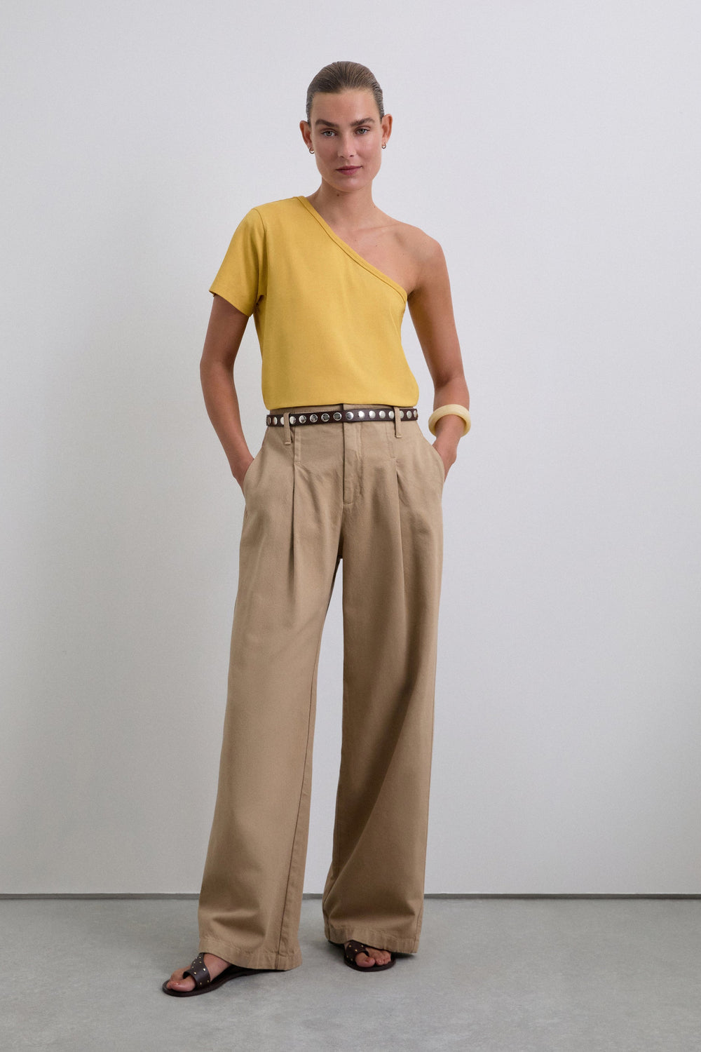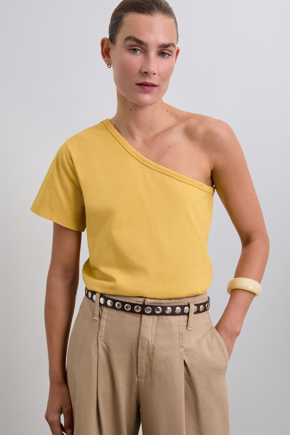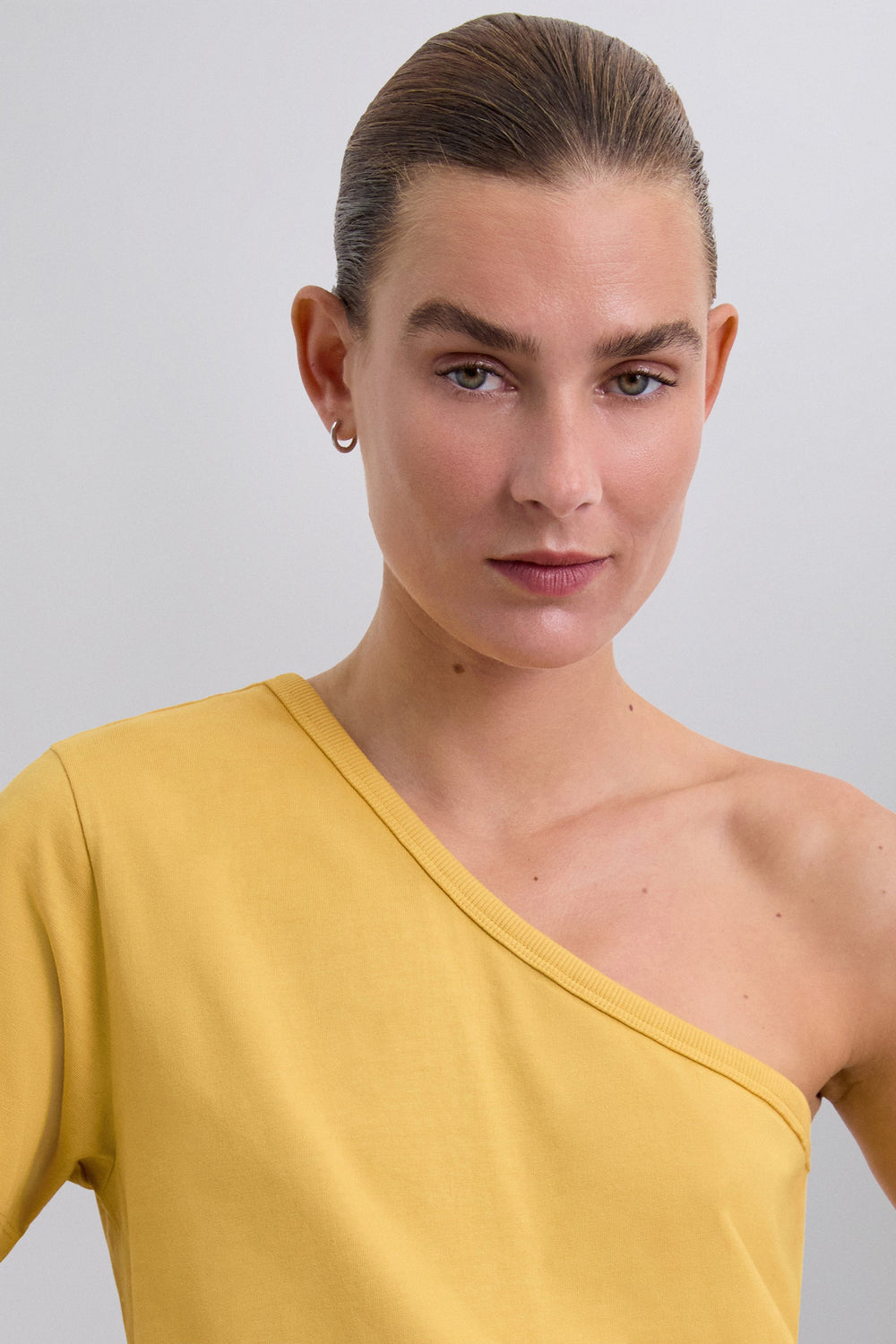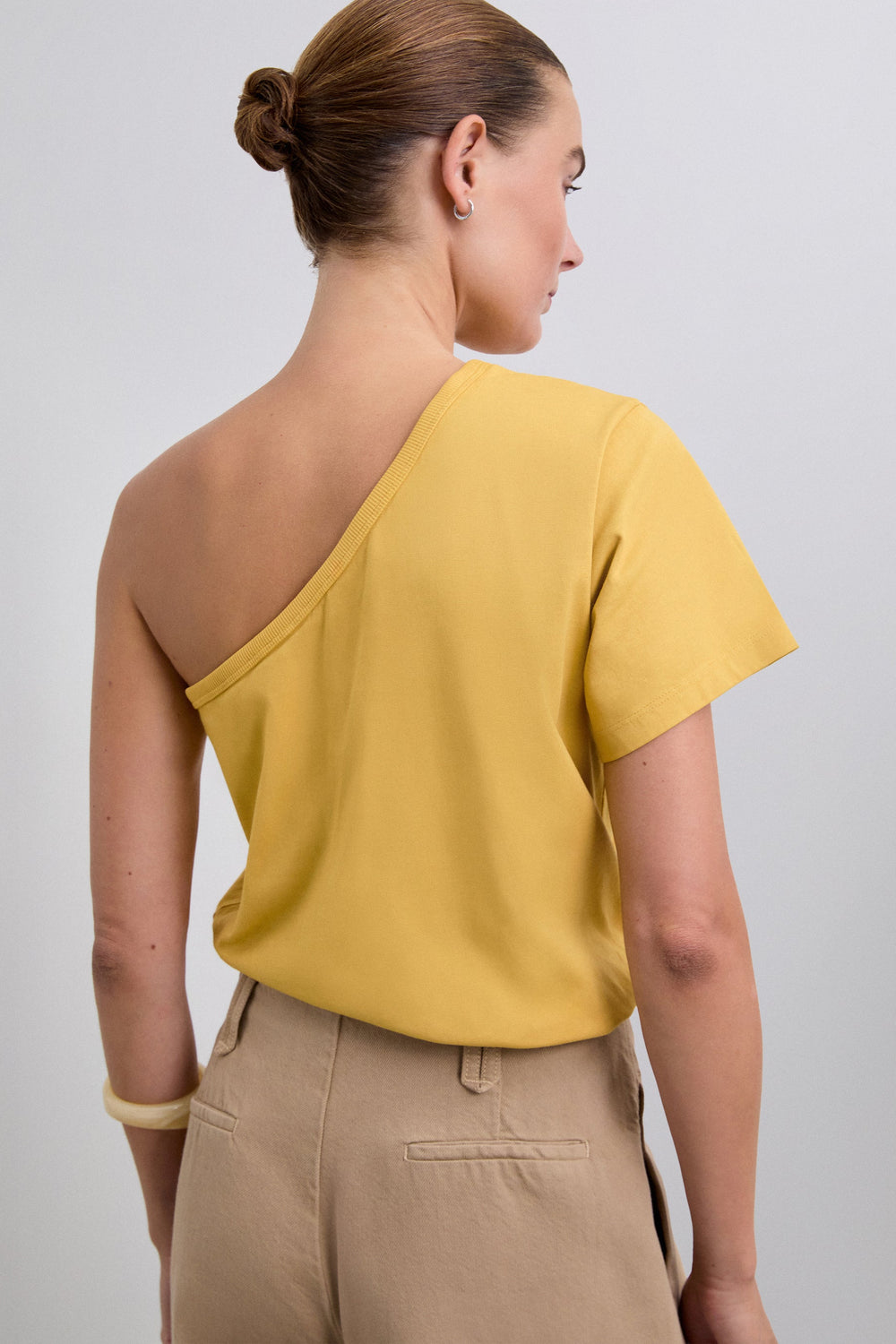 Top made of 100% BCI cotton. Asymmetric neckline and short sleeves.