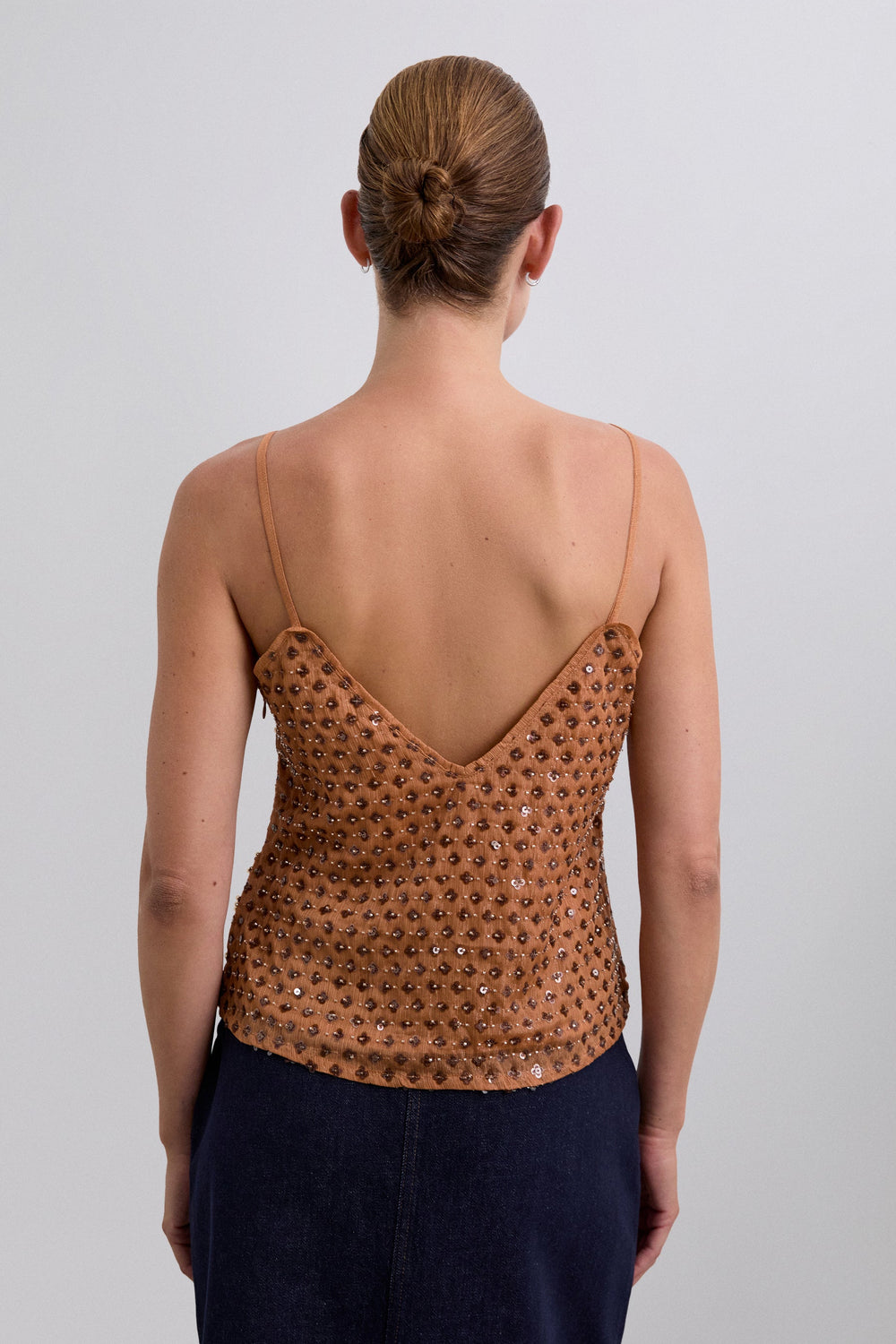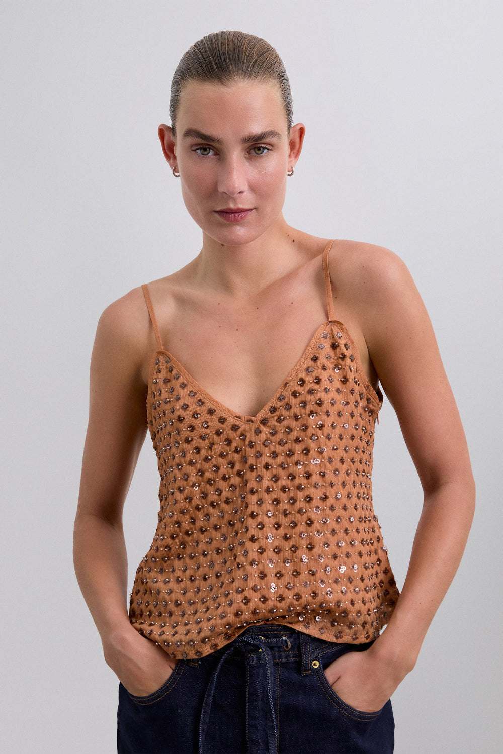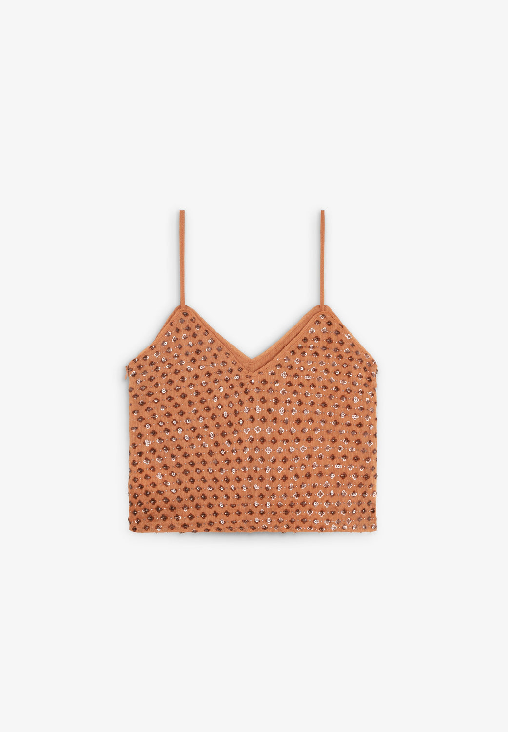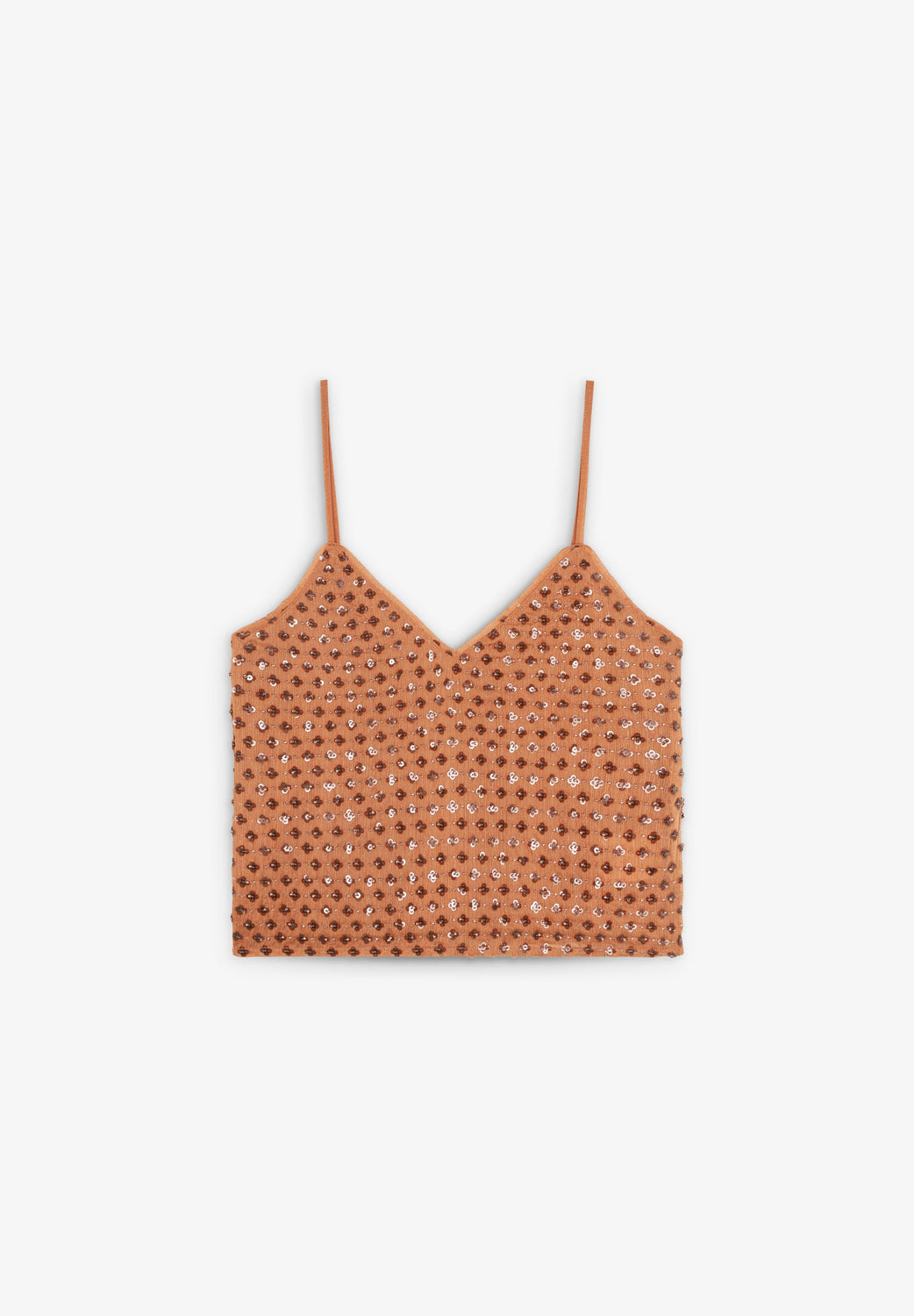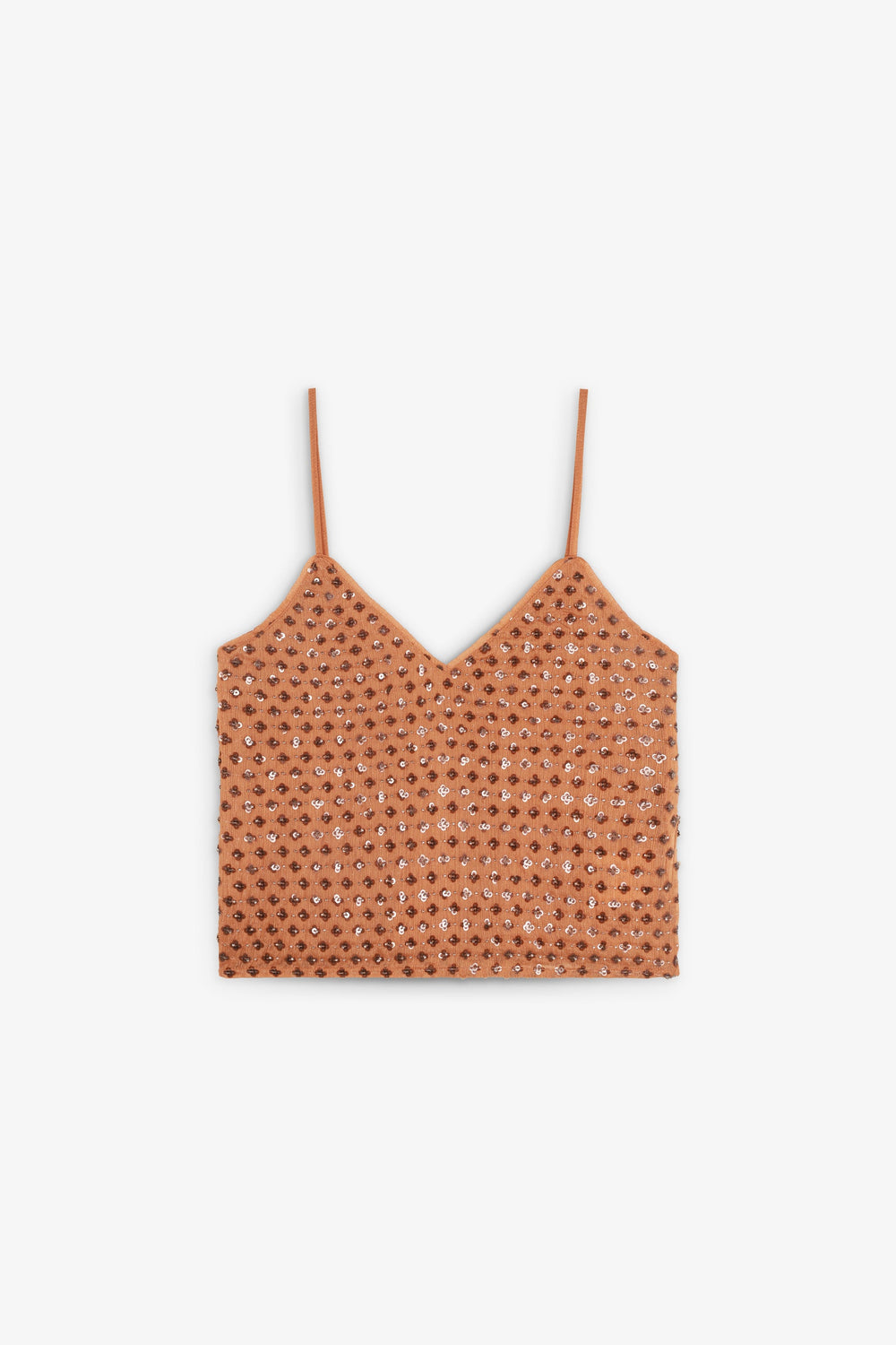 V-neck top with thin straps. Sequinned appliqué detail. Side zip fastening.
