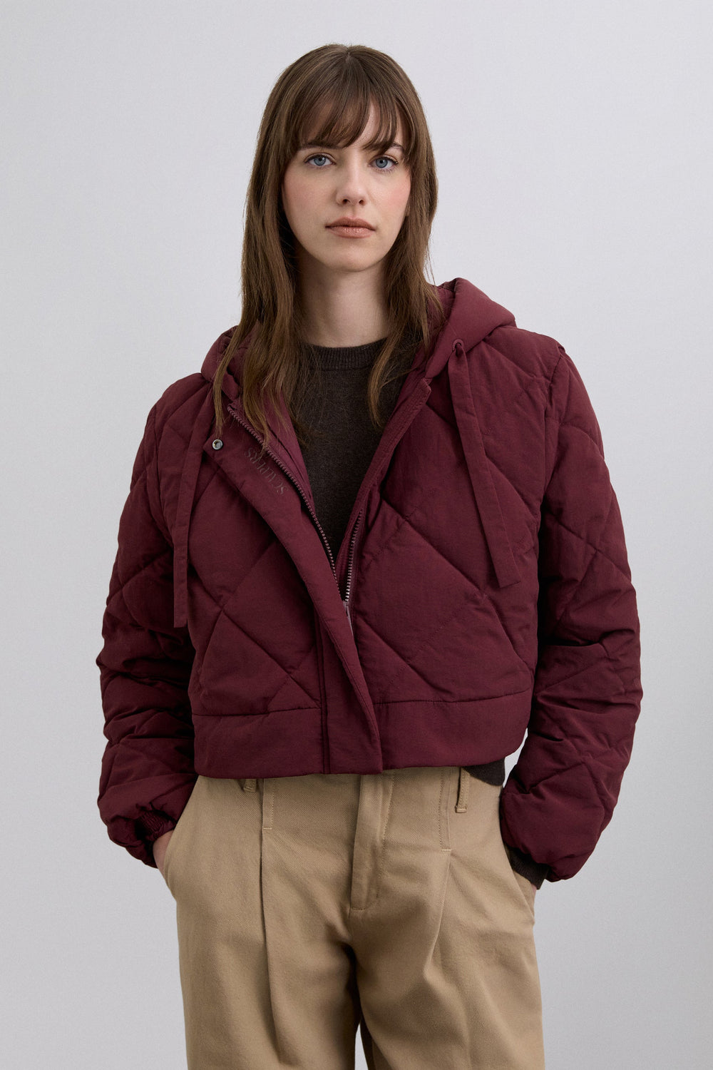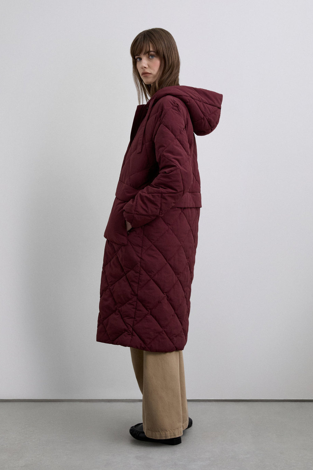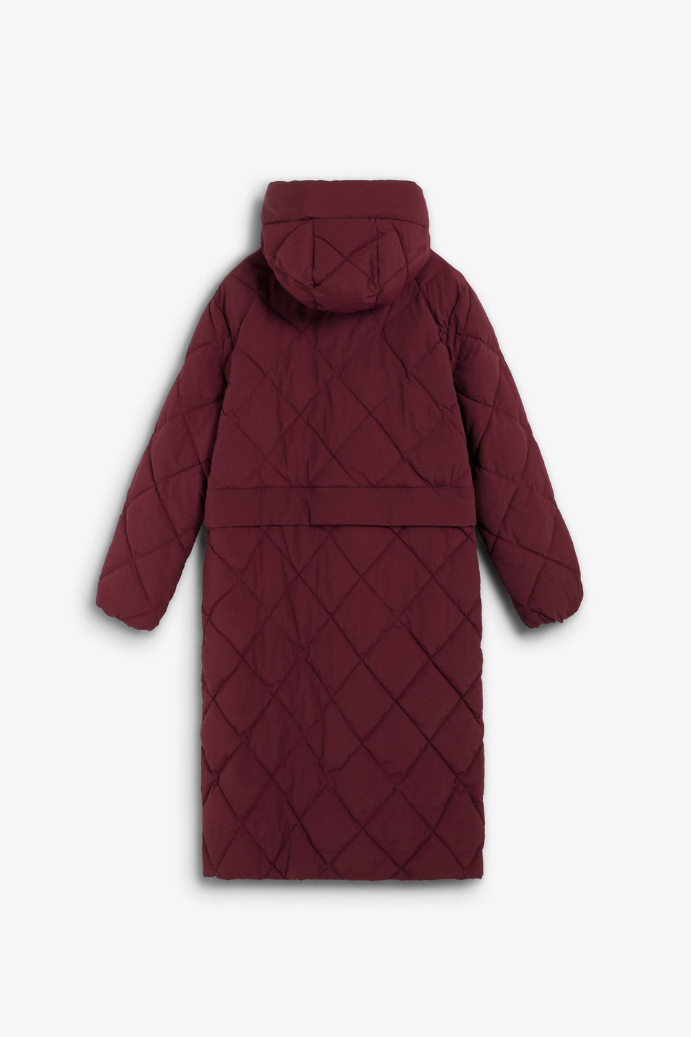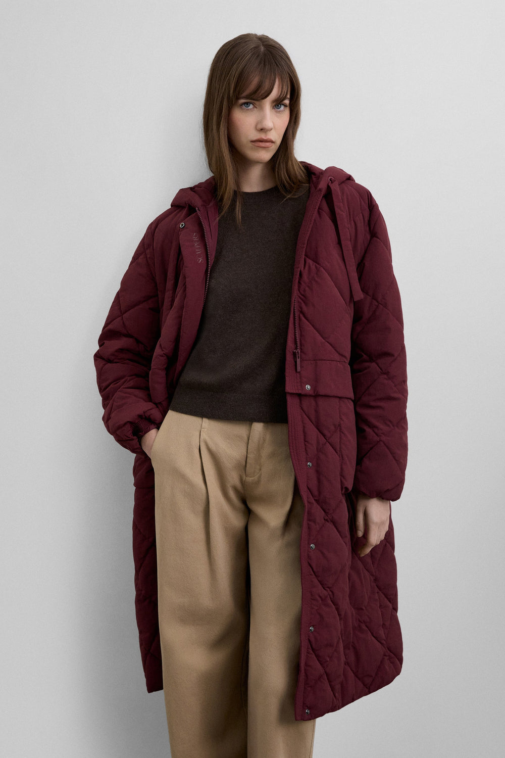 Detachable waterproof nylon padded long coat. The long coat can be converted into a short jacket. Front concealed zip fastening. Hood.
