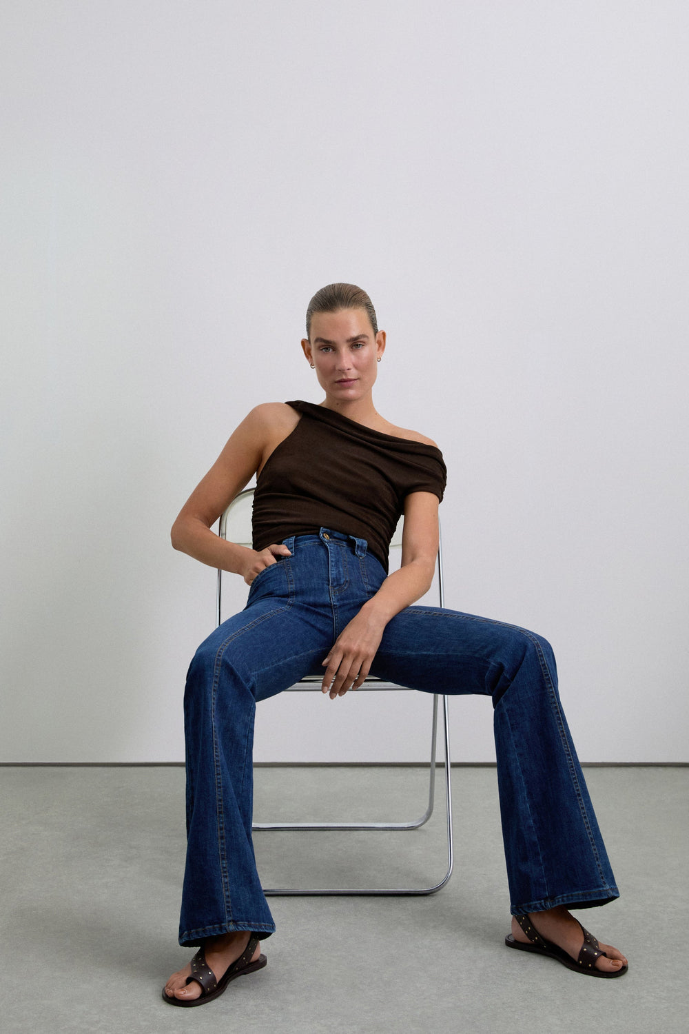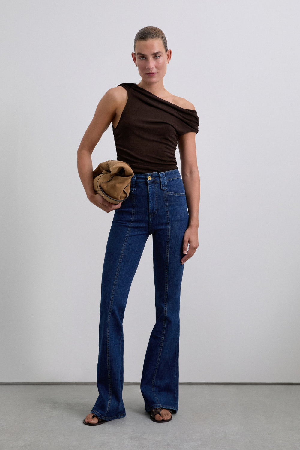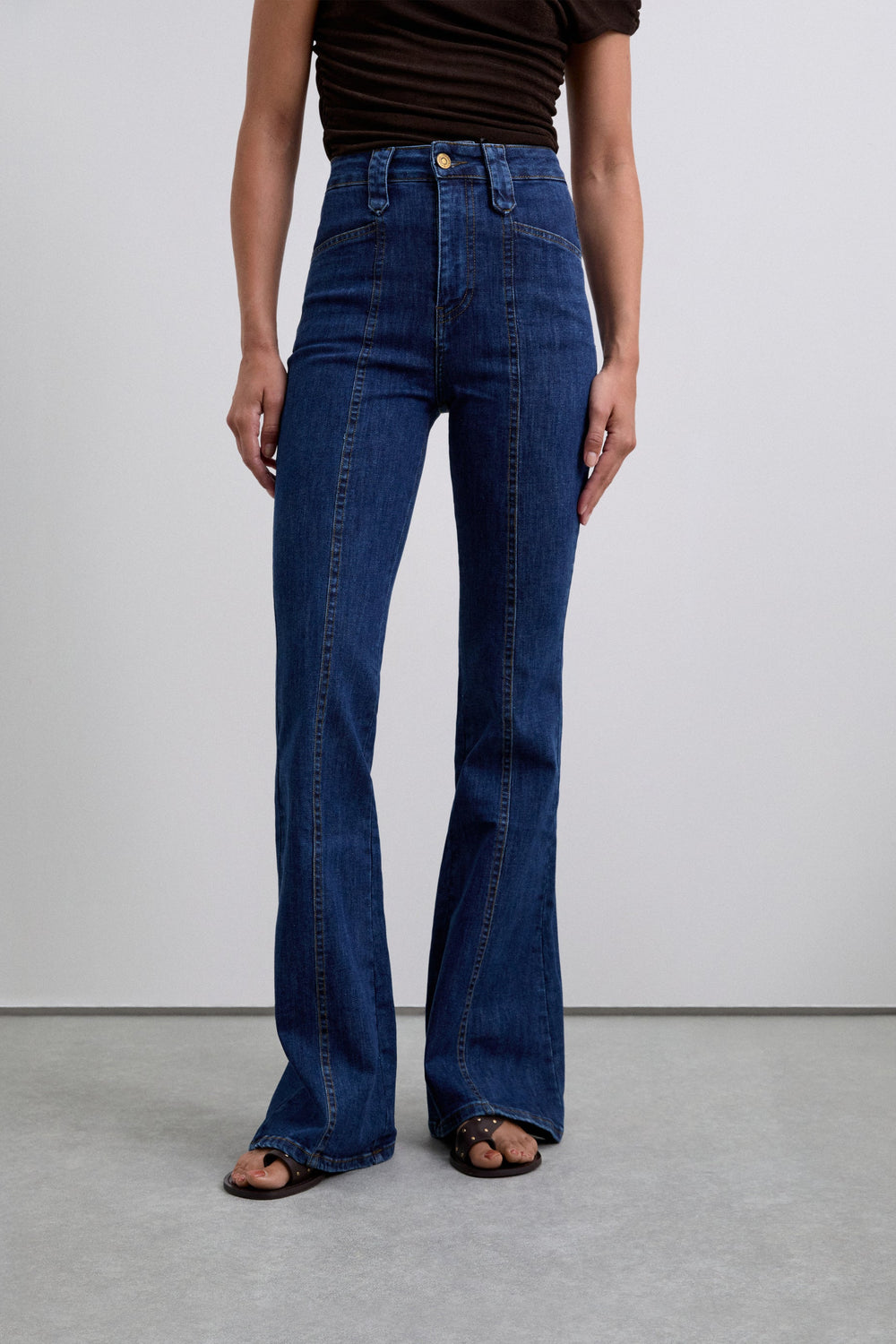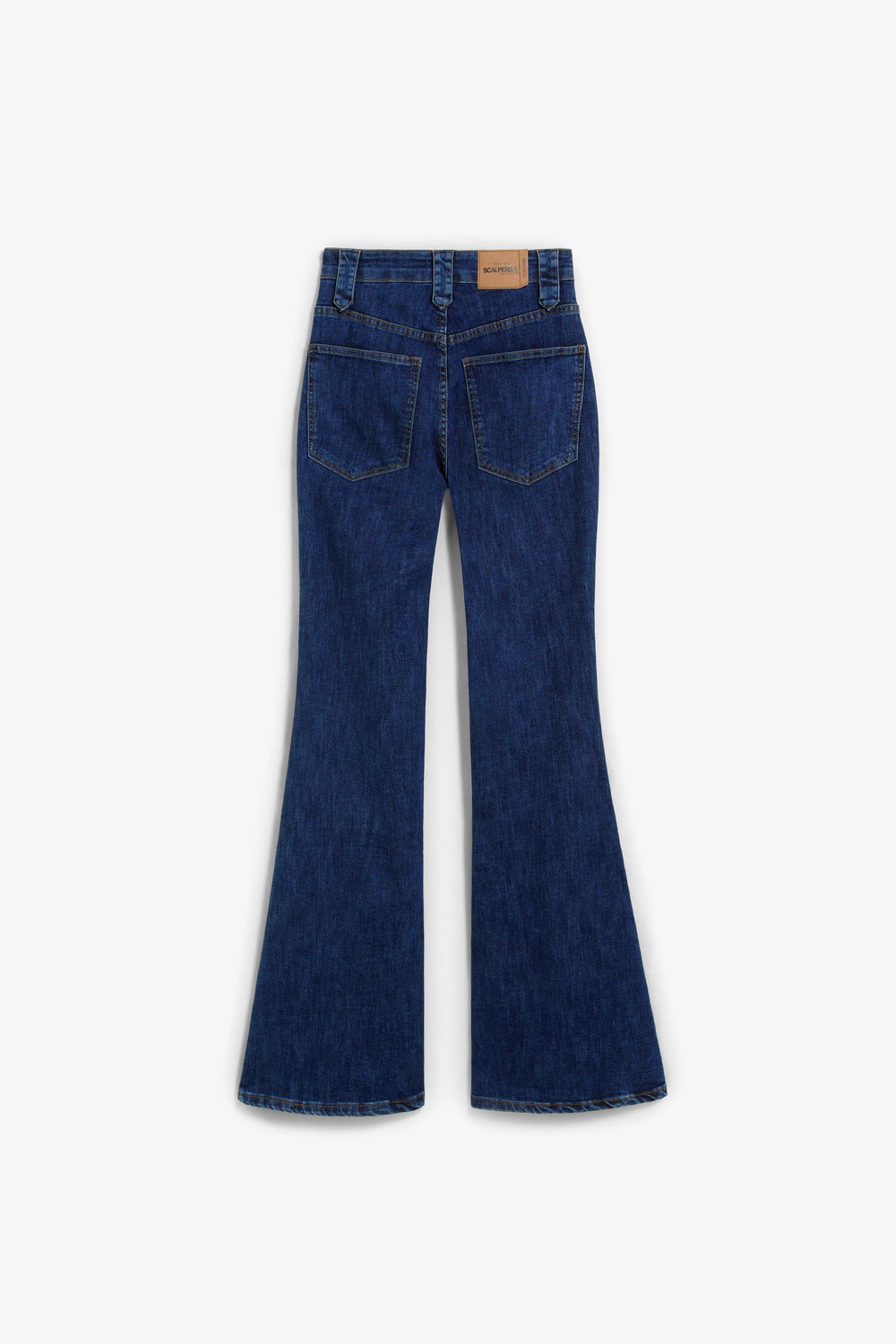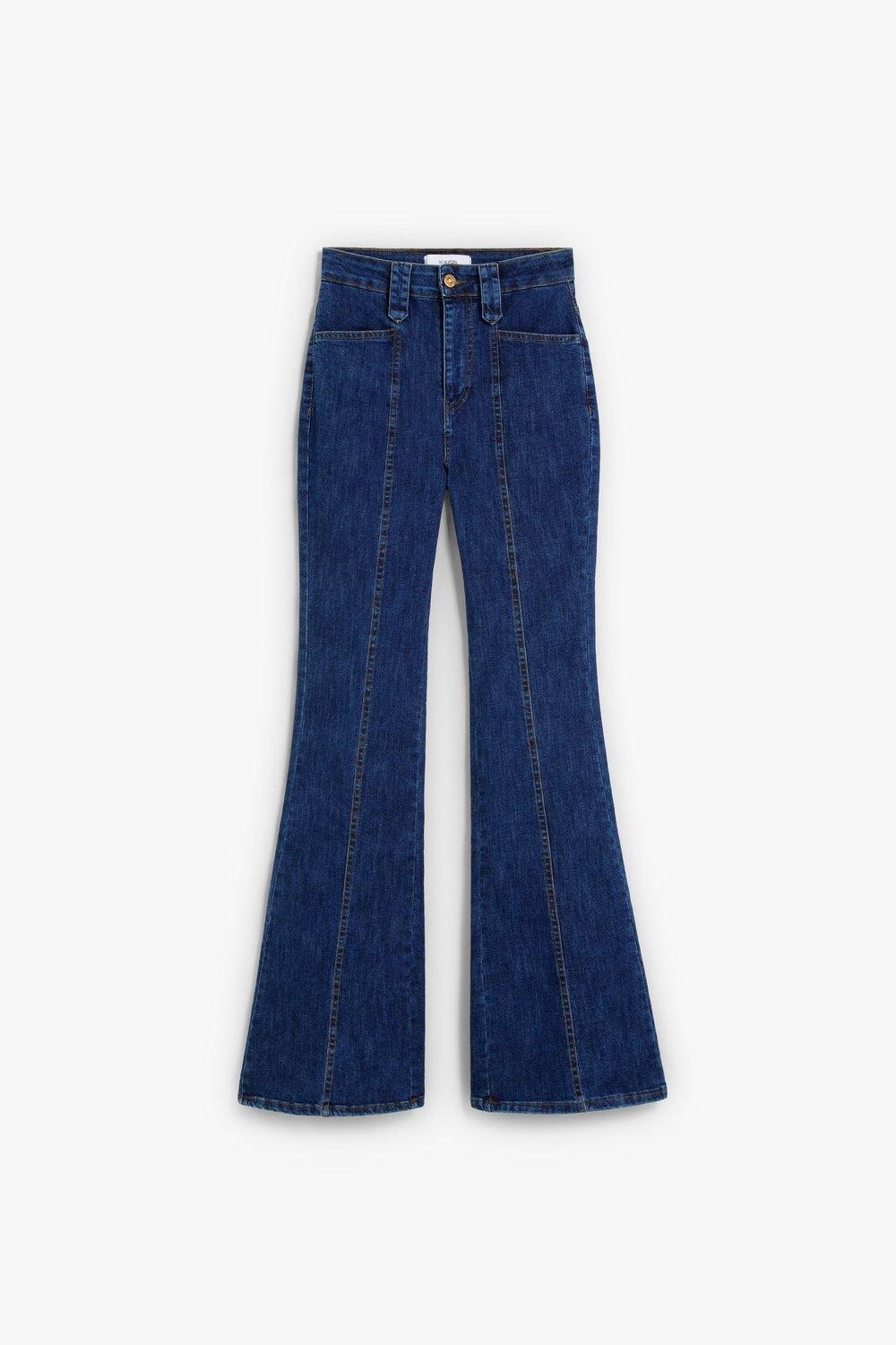 High-waisted bootcut jeans. Centre seam at the front. Front and back pockets. Button fastening and belt loops. Logo label detail at the back.