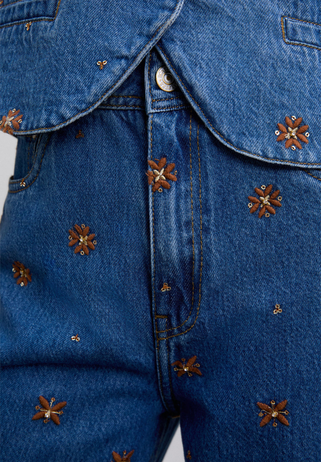 Straight jeans with high waist. Embroidered flower details. Front and back pockets. Button fastening and belt loops. Logo label detail at the back.