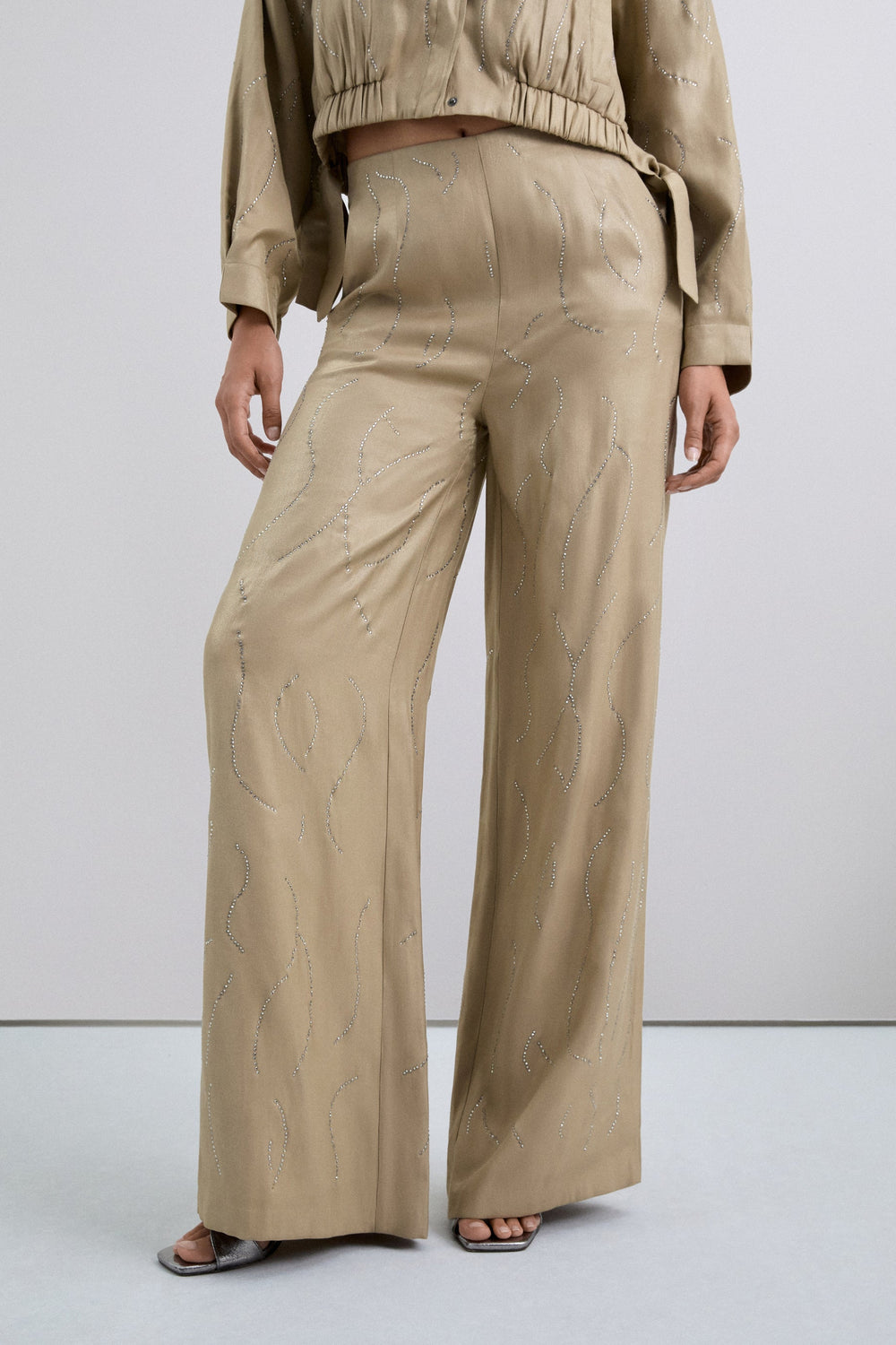 Trousers with rhinestone detailing. Elasticated waistband. Flowing fabric with satin finish. Side pockets.