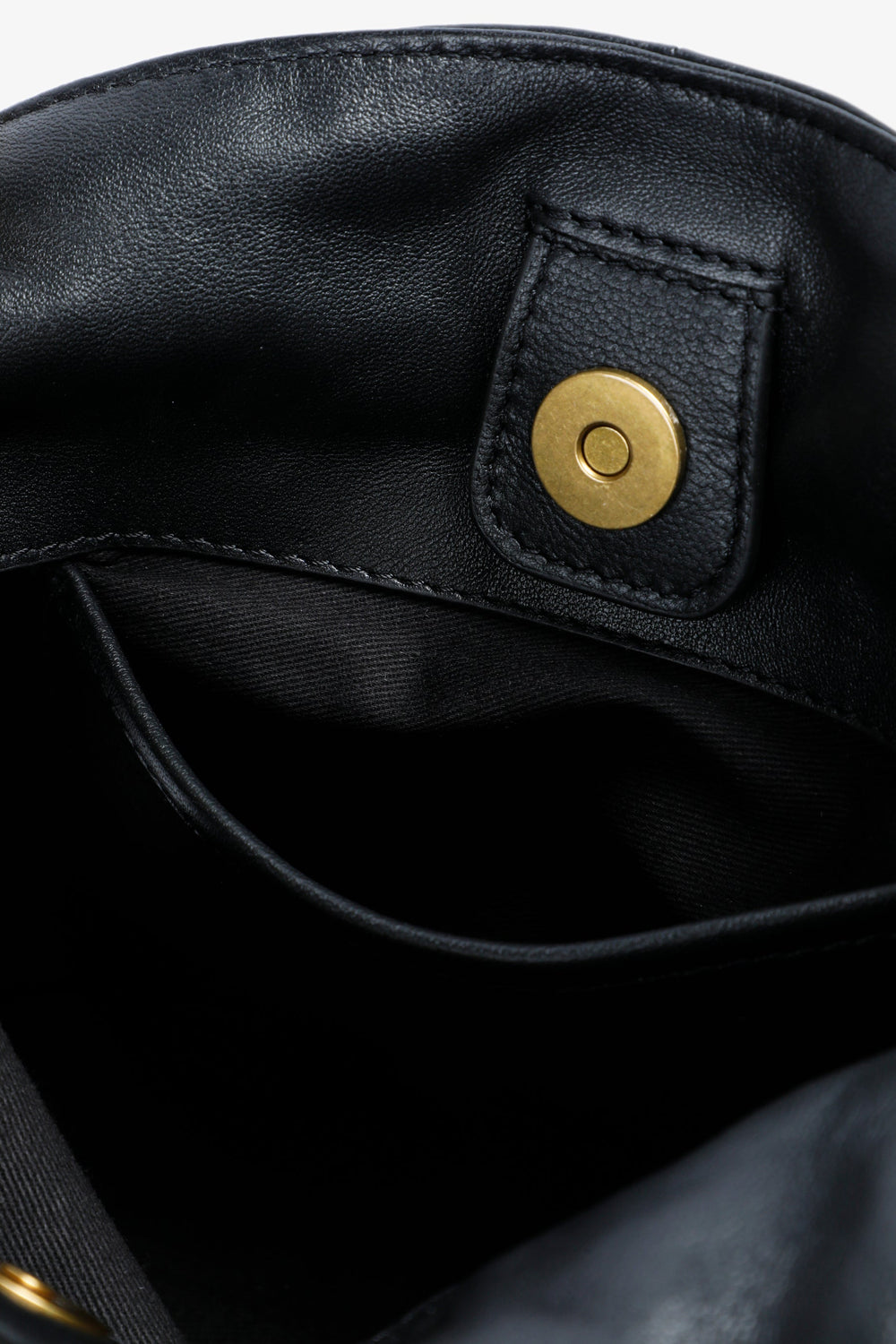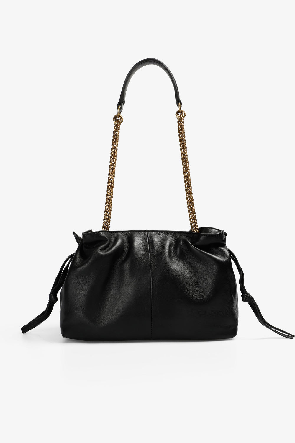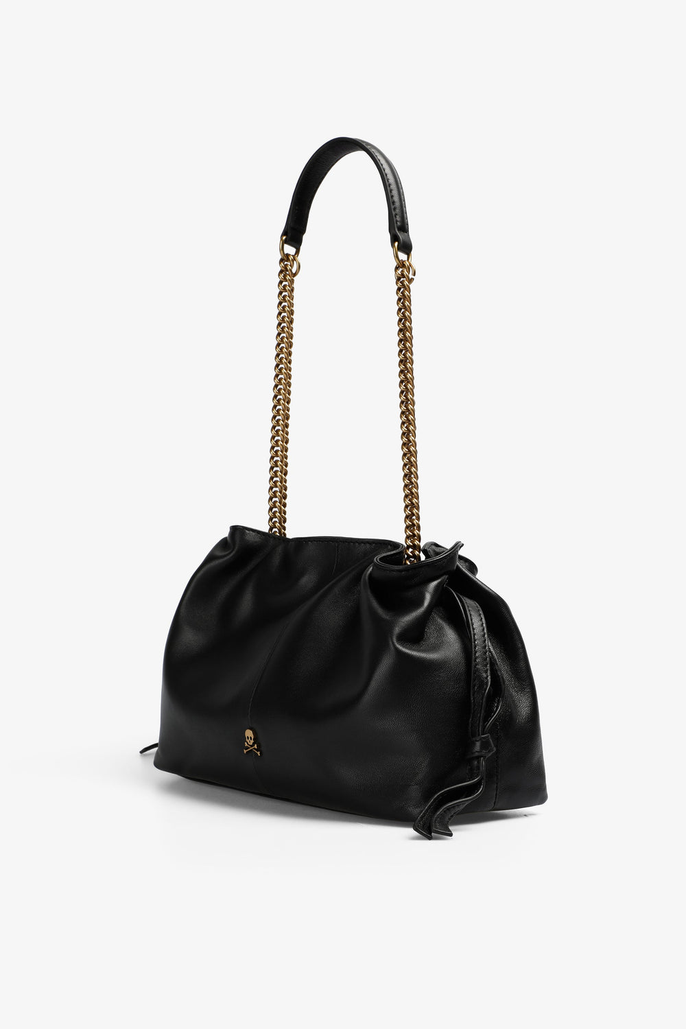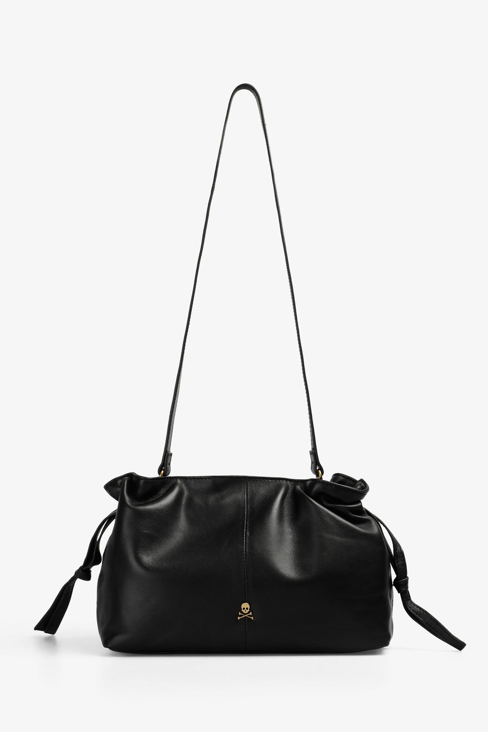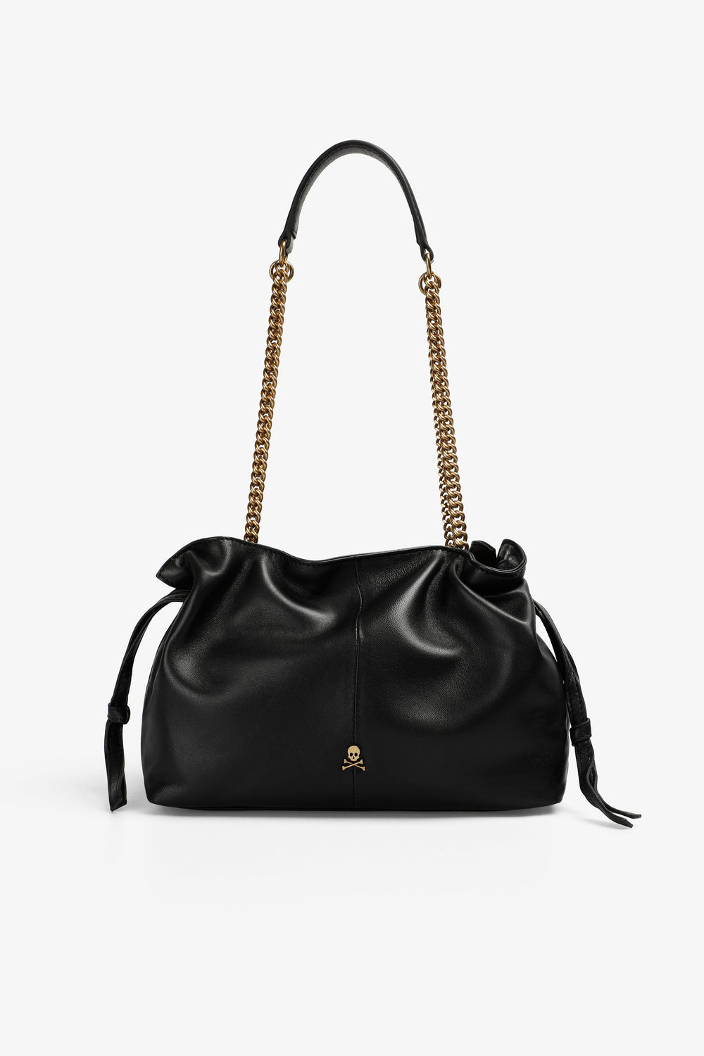 Bag made of 100% leather. Inner compartment. Shoulder chain. Button closure. Side adjusters. Front metal skull detail.