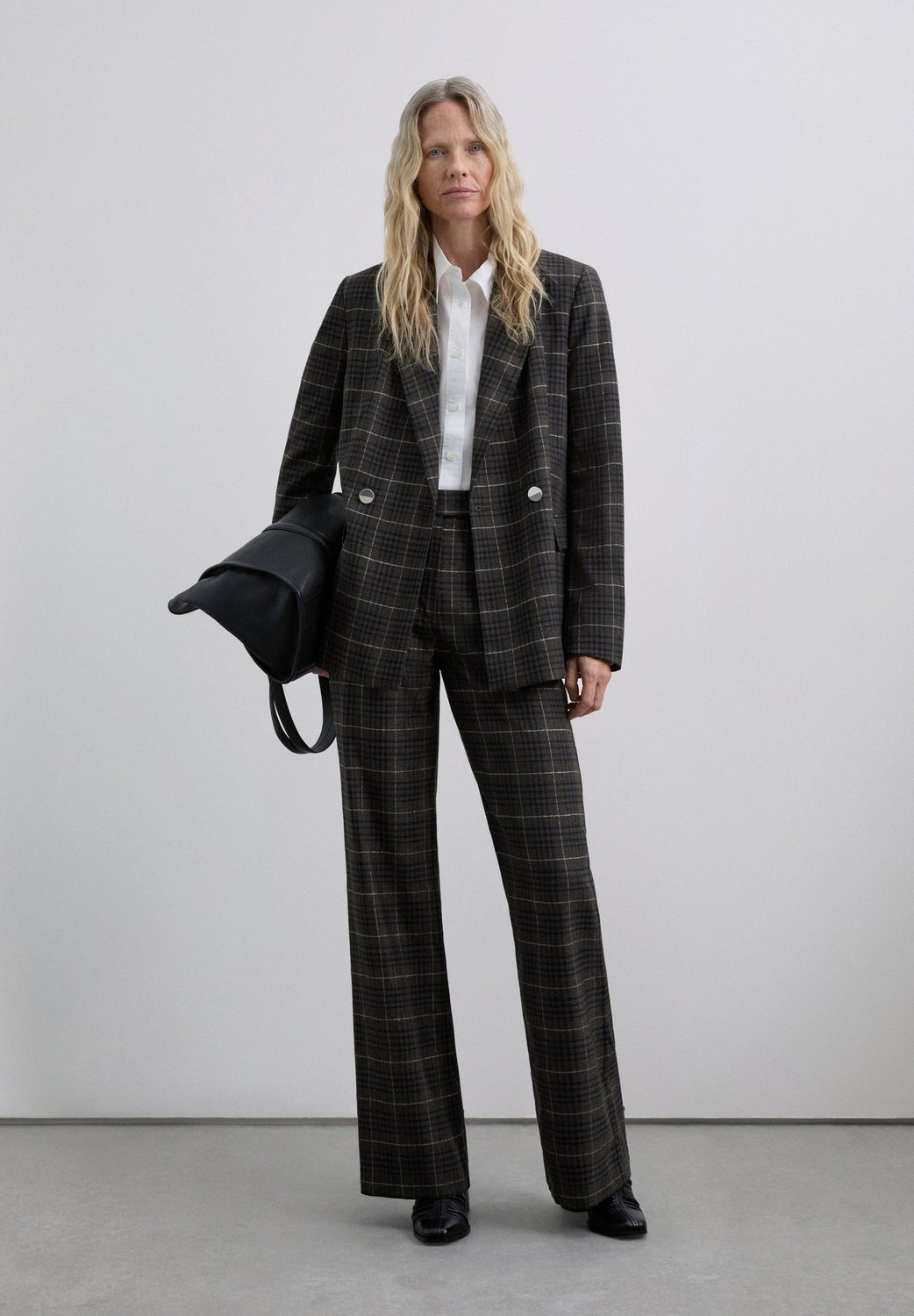 Blazer with pointed lapel. Long sleeves. Double-breasted front button fastening. Two welt pockets. Check print.