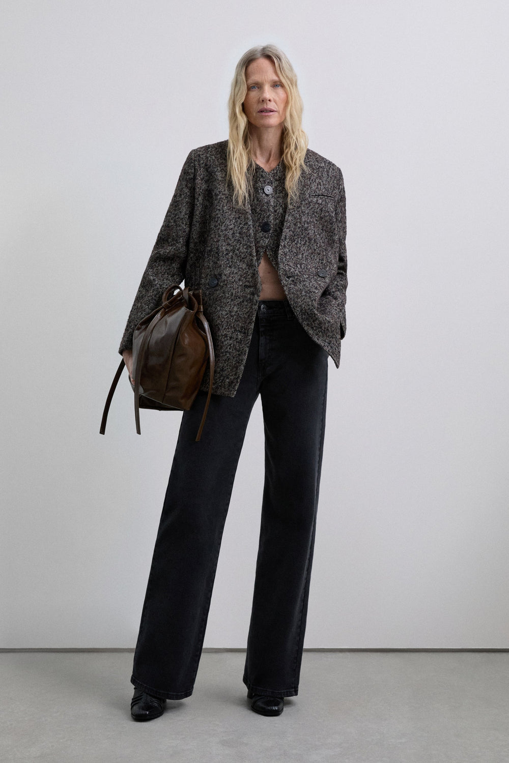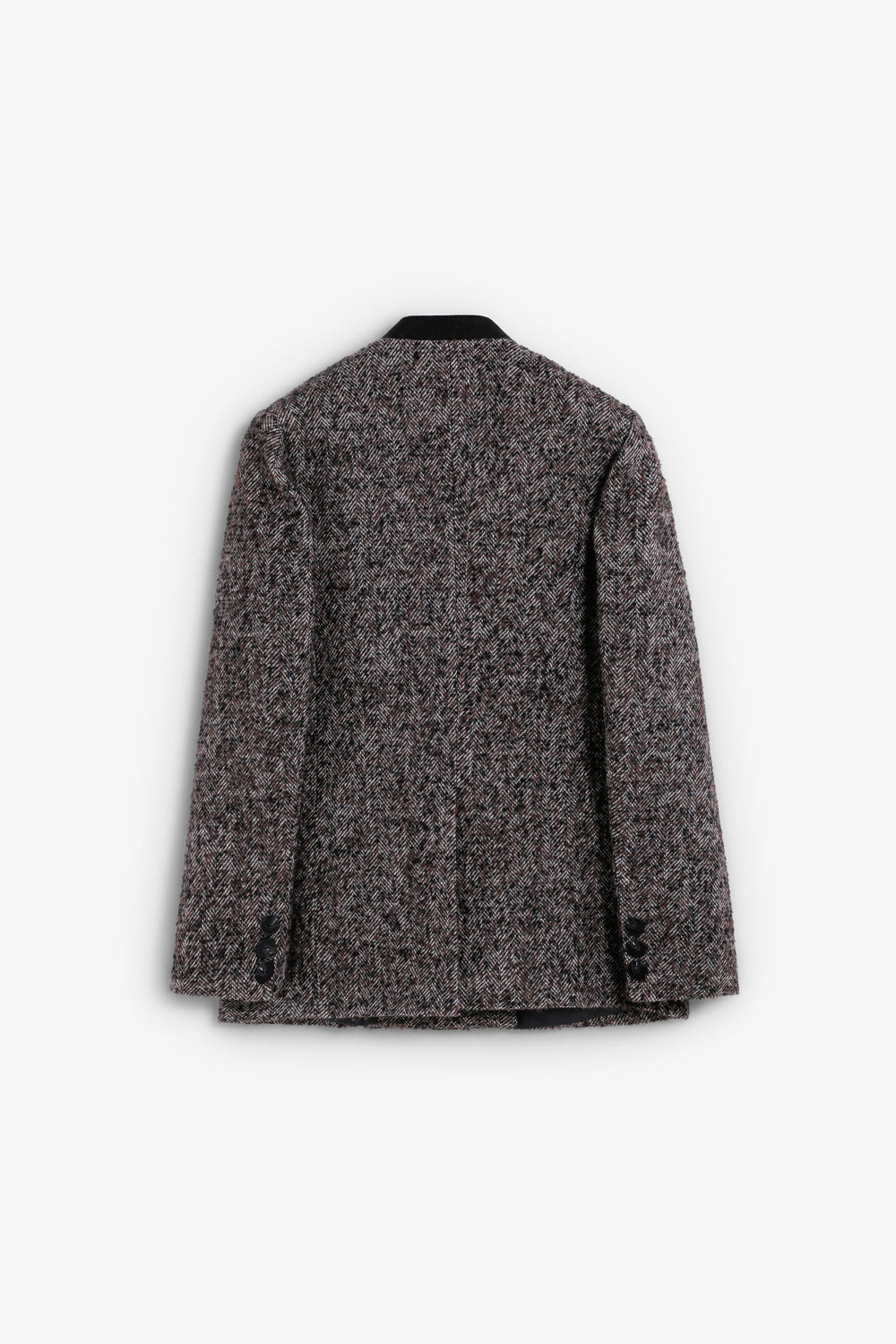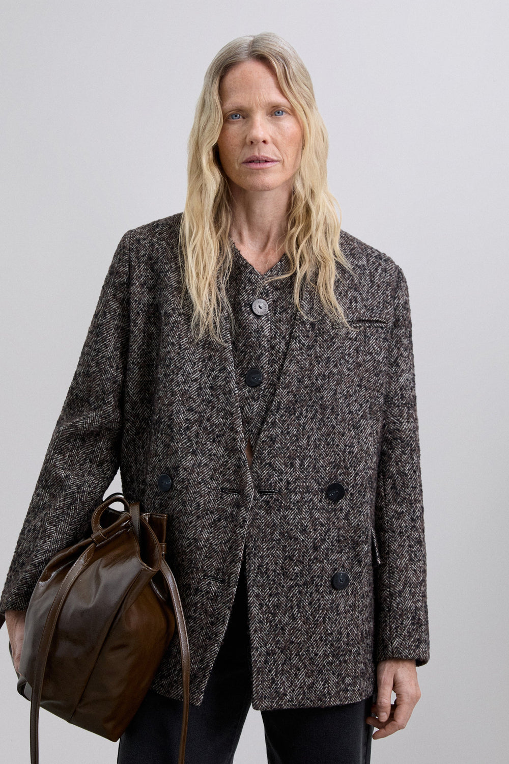 Collarless wool blazer. It comes with a short, fitted waistcoat. Long sleeves. Two back pockets with flaps. Front button fastening.