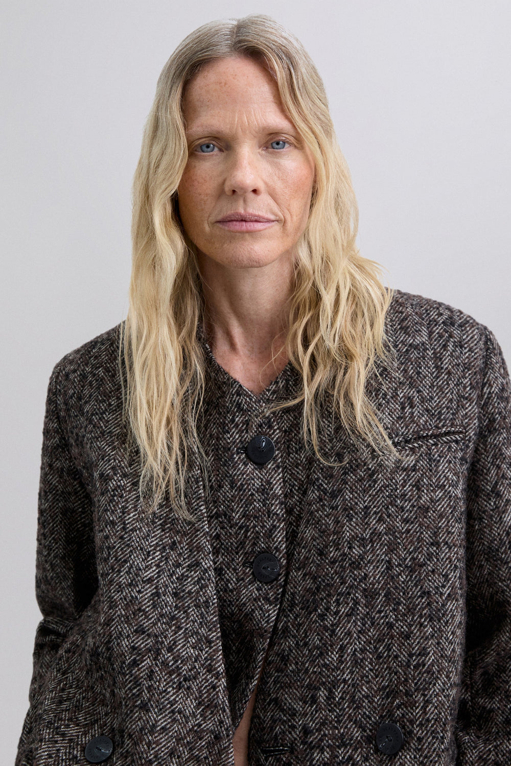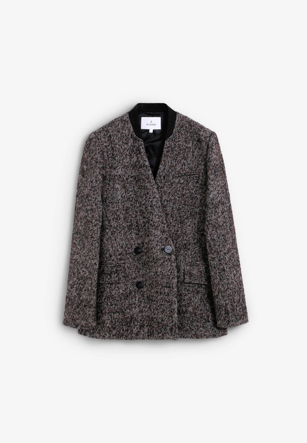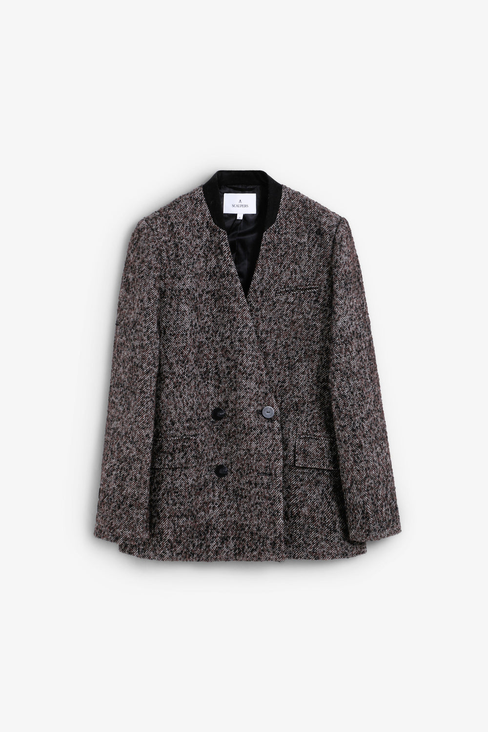 Collarless wool blazer. It comes with a short, fitted waistcoat. Long sleeves. Two back pockets with flaps. Front button fastening.