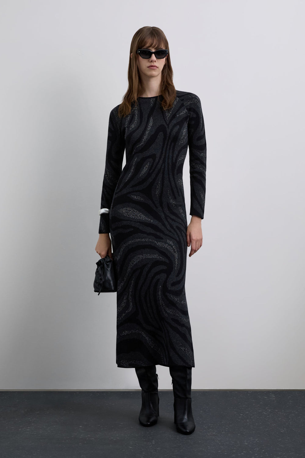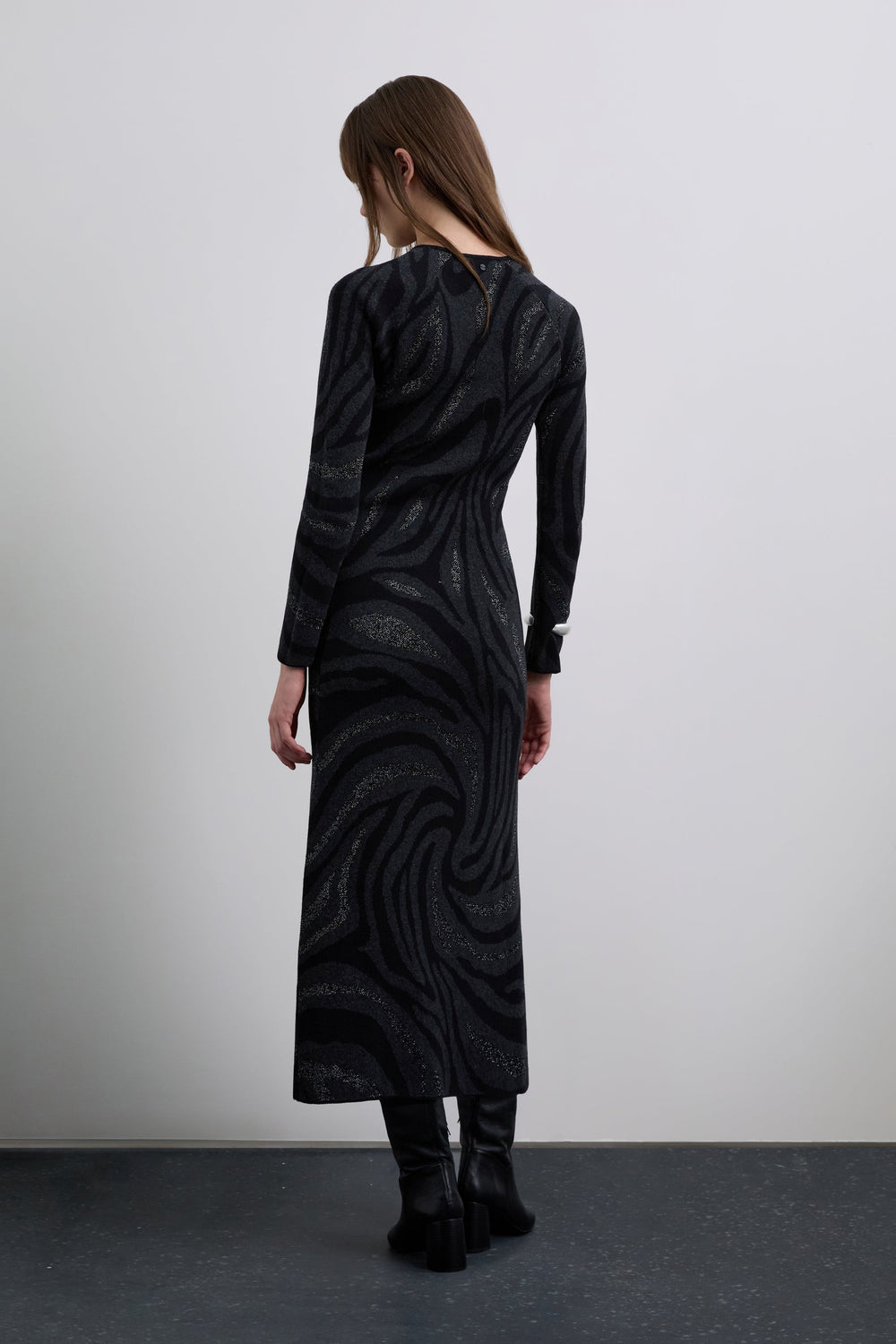 Long printed knit dress. Long sleeves. Round neck. Matching metallic appliqué detail on the back.