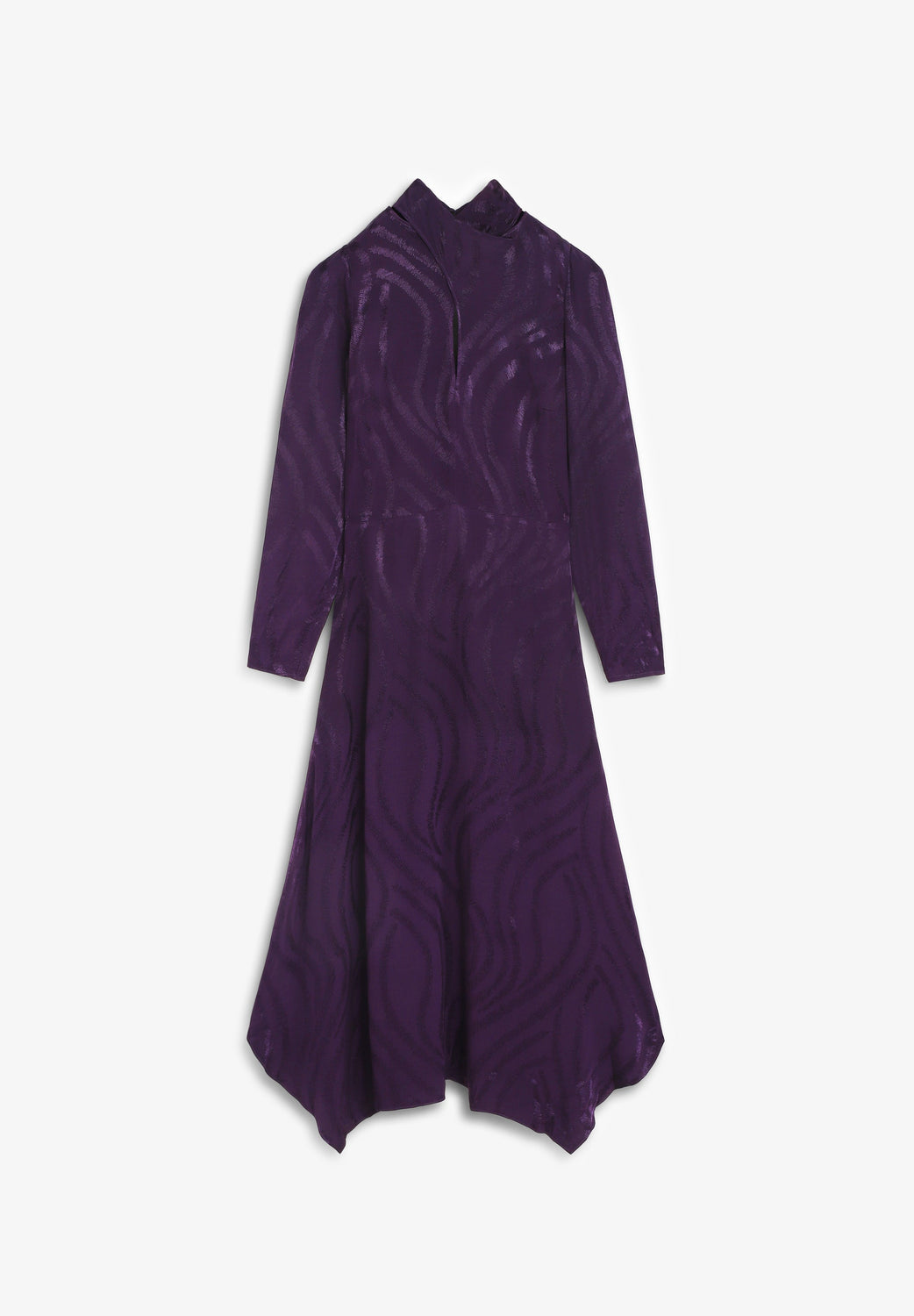 Long dress with embossed wavy design. Flowing design with uneven asymmetrical hem. Long sleeves. High closed neckline. Back fastening with invisible zip.
