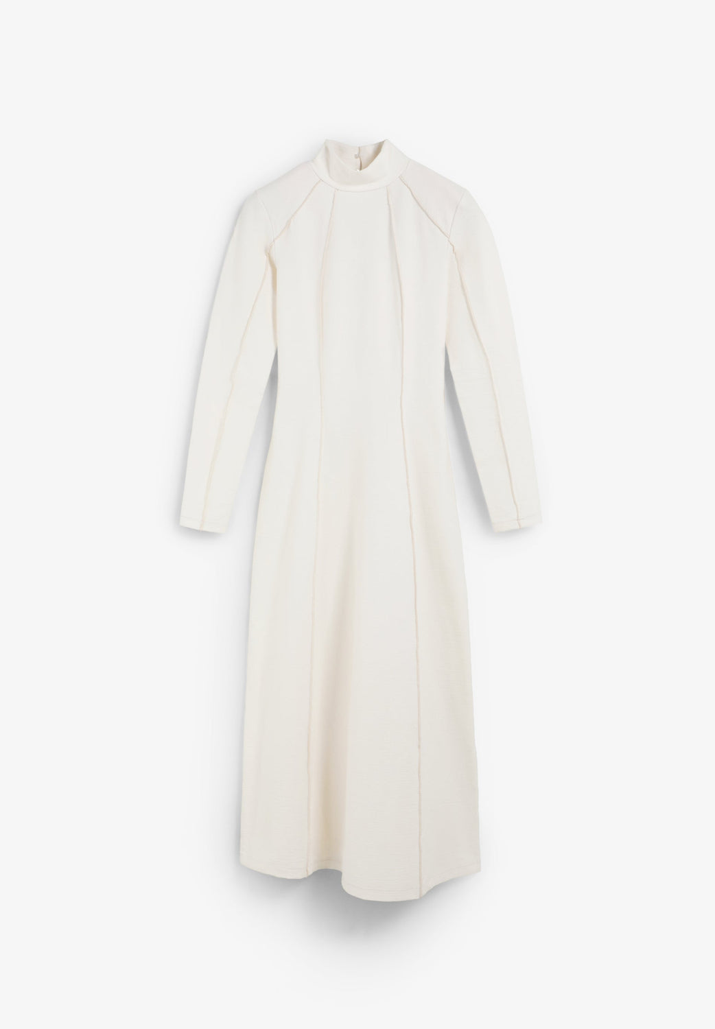Knit midi dress made of BCI cotton. Long sleeves. High neck. Overlock stitch.