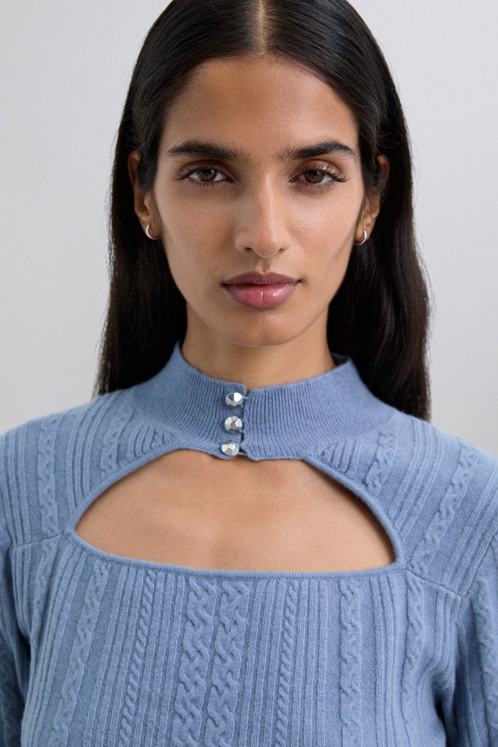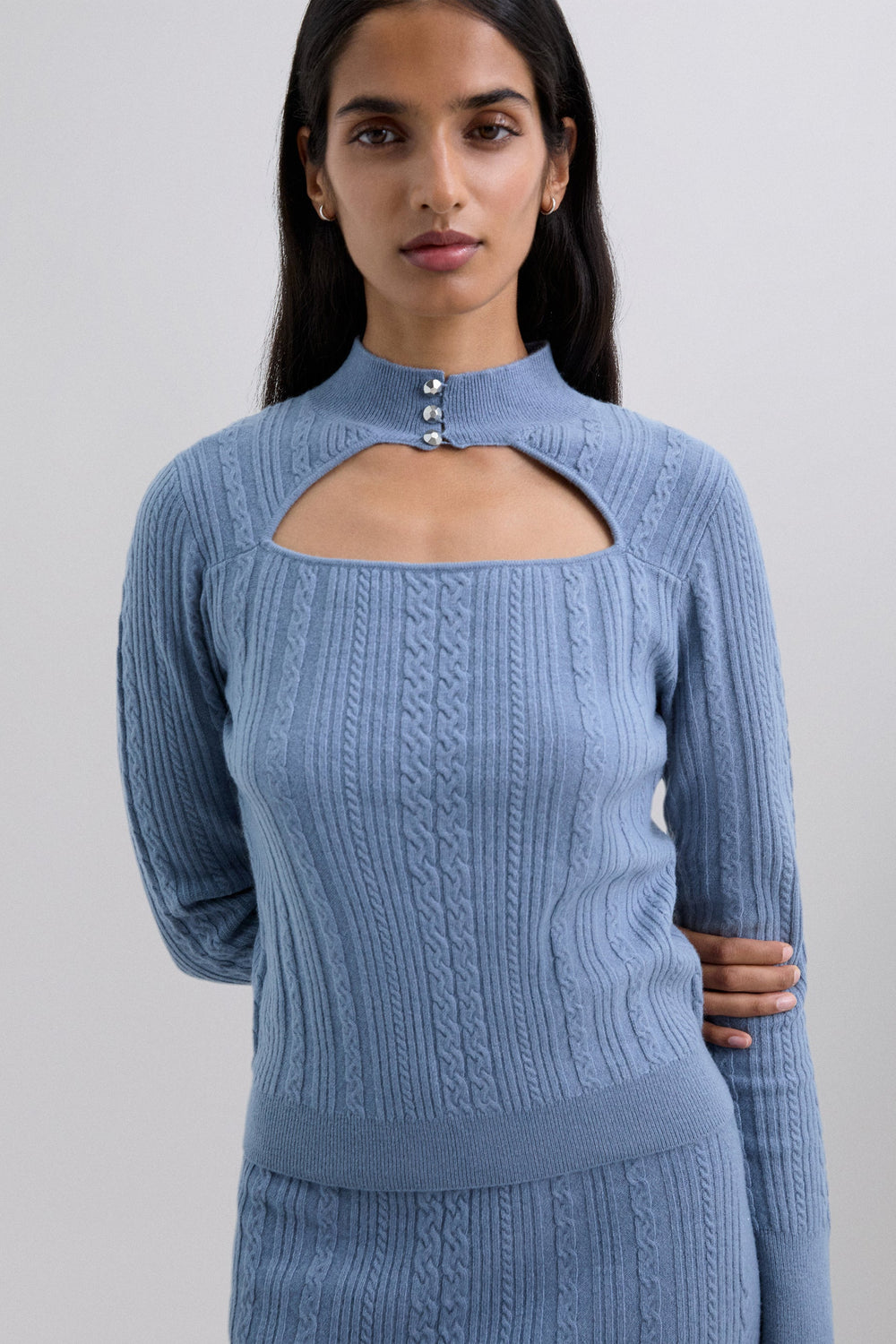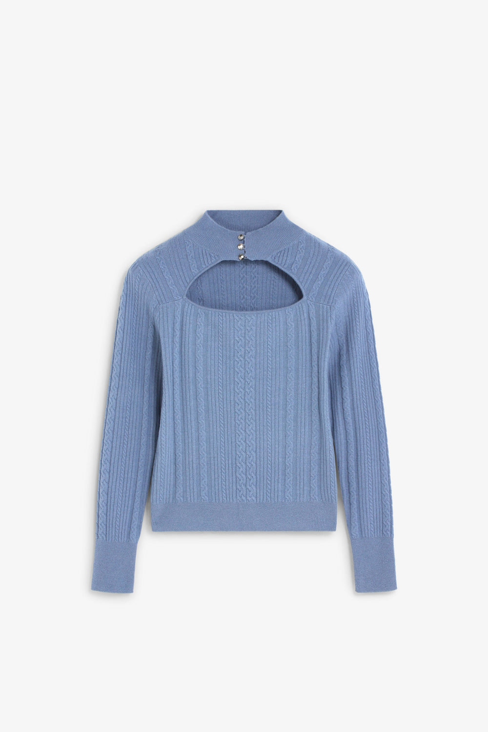 Cable knit sweater made of a wool and cashmere blend. Slim fit. High collar with button fastening. Cut-out at the neckline.