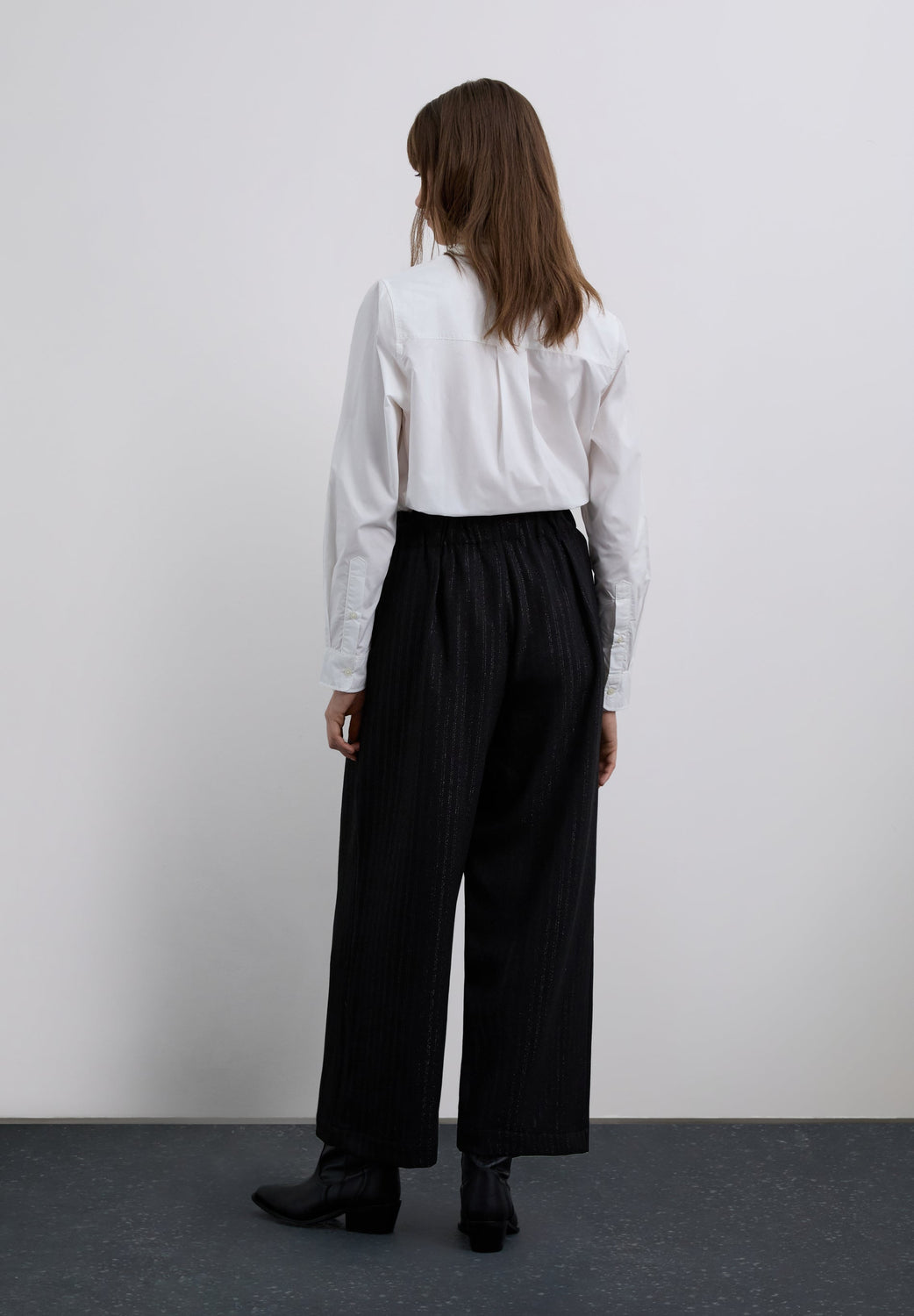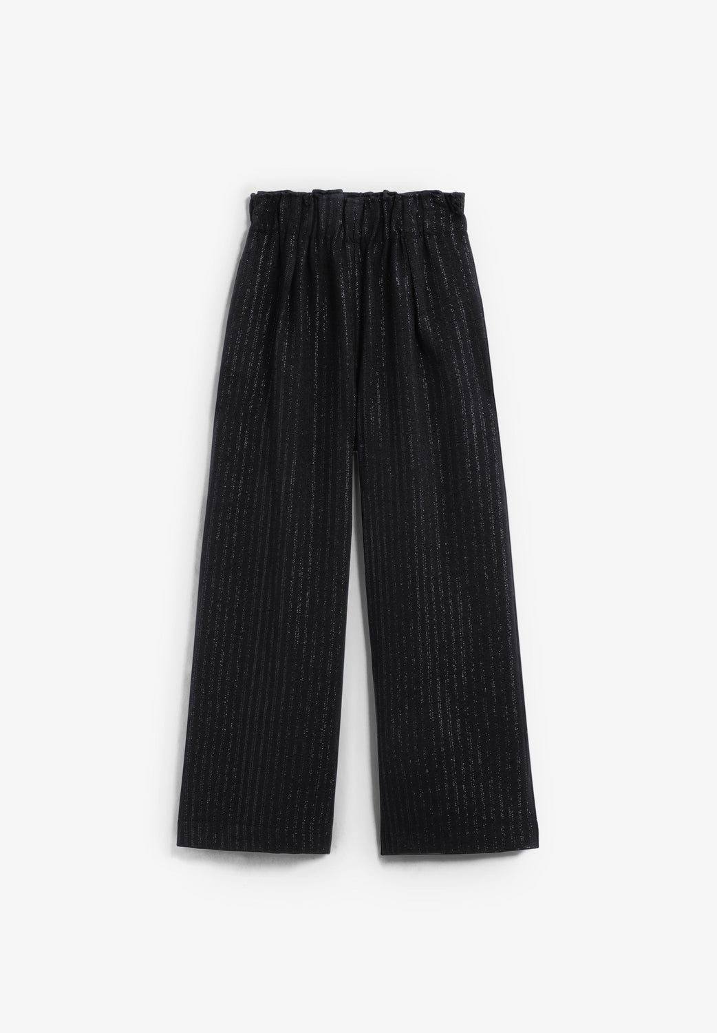 Pinstripe trousers with metallic detailing. Gathered waist. Regular fit.
