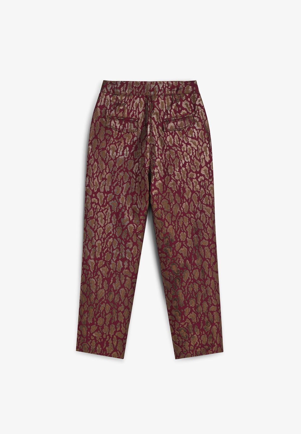 Trousers made of a metallic-effect fabric with animal print. Seams detail. Zip fastening. Asymmetric hems.