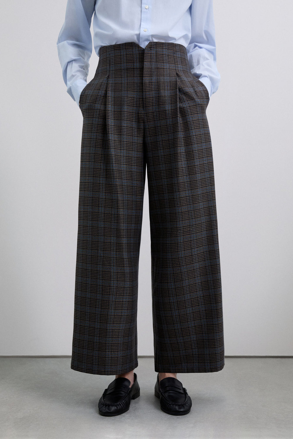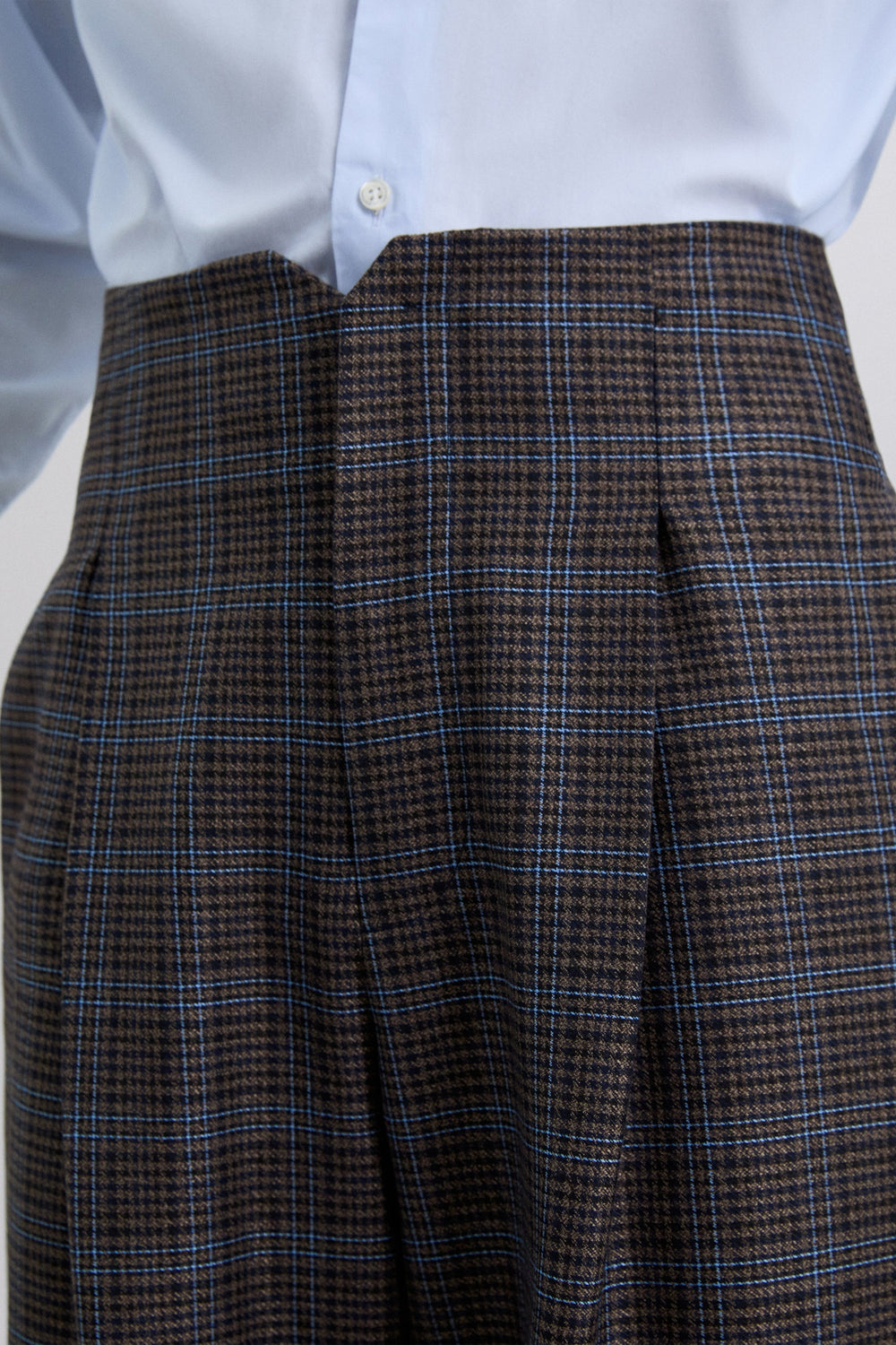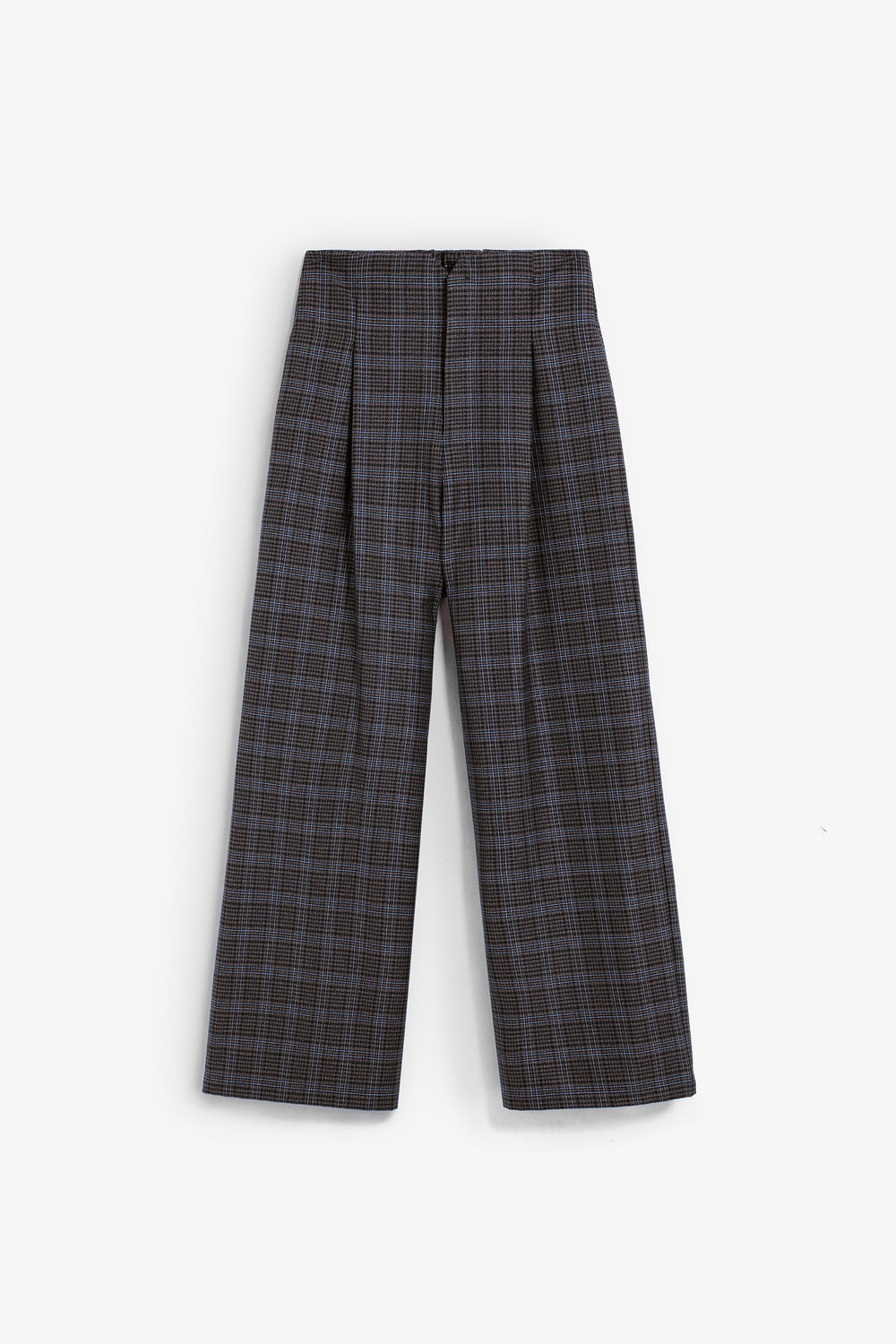Culotte style trousers. Pleat detail on the front. Concealed zip and button fastening. Check print.