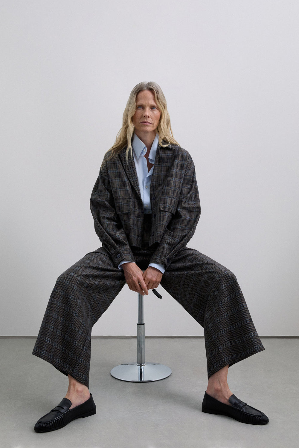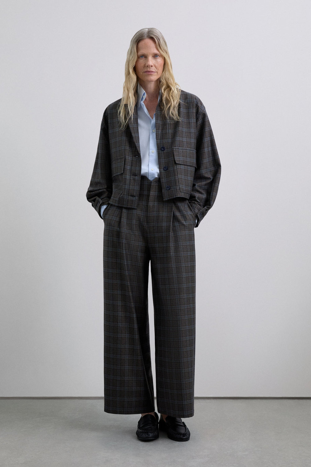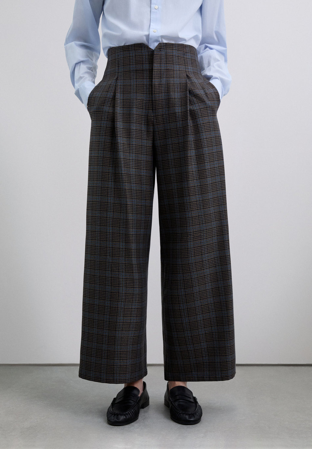 Culotte style trousers. Pleat detail on the front. Concealed zip and button fastening. Check print.