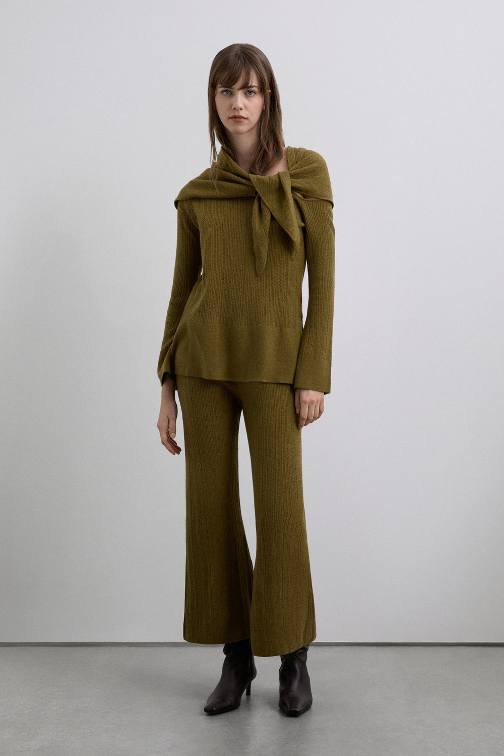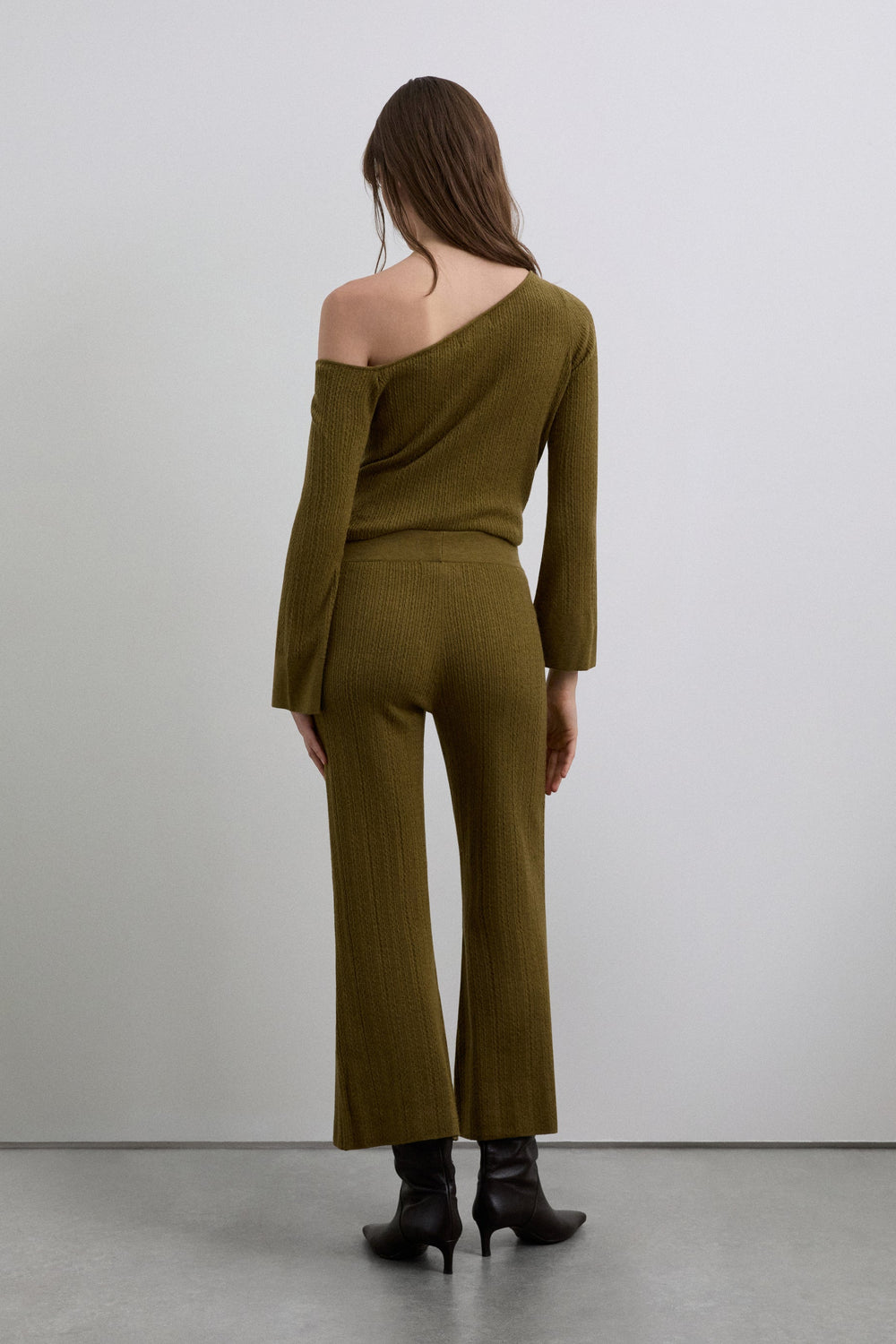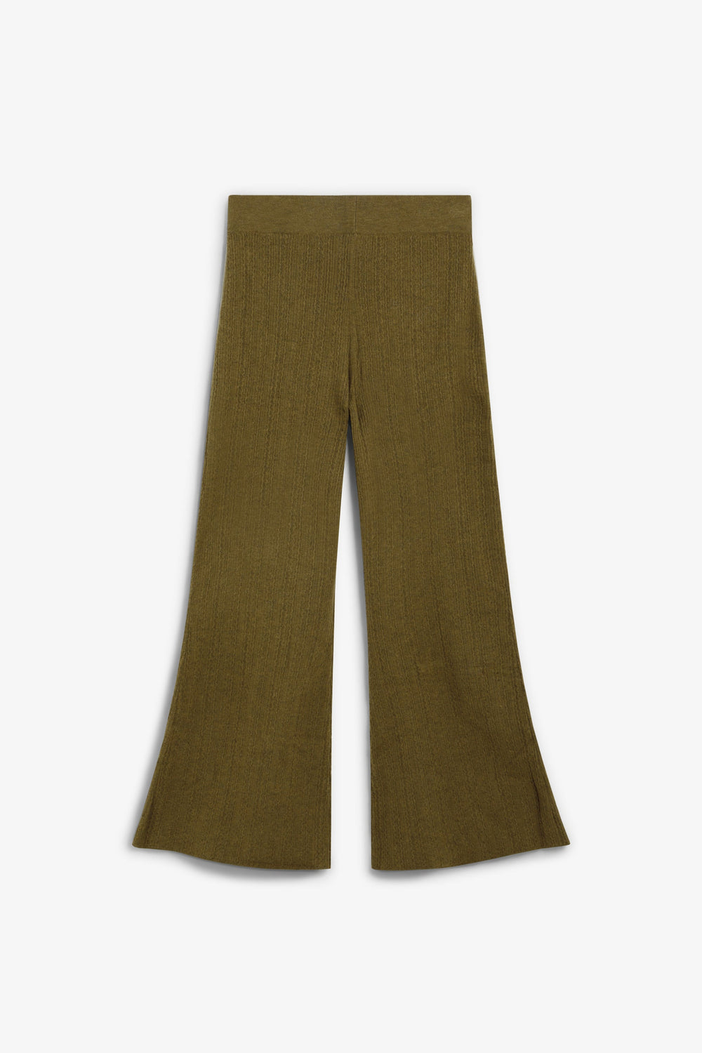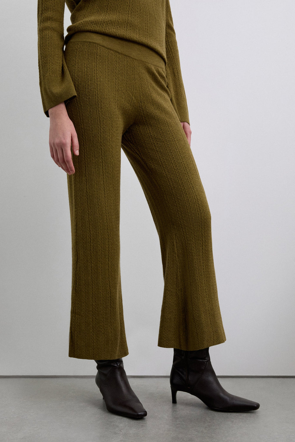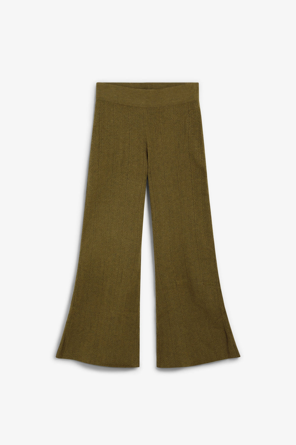 Trousers made of a cotton and wool blend. Fine cable knit texture. Flowing fabric with elastic waistband for snug fit. Long bell-bottom trousers.