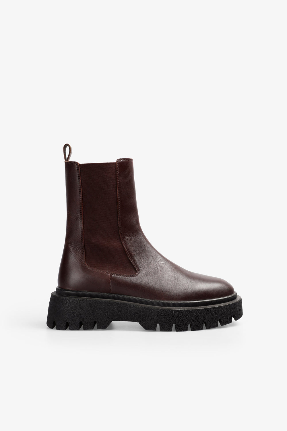 Burgundy leather Chelsea boots with tonal elasticated sides and TPR track sole for flexibility. Mid-calf model with clean lines and a robust finish.